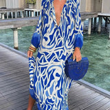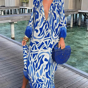 With this flowing, playful maxi dress, you'll look stunning in any setting. It pairs easily with wedge sandals or flat ballet shoes. Featuring a notched V-neck and a button placket. The balloon long sleeves come with a elastic cuff. The lightweight and breathable fabric is versatile enough to be worn as a kaftan in a resort style, belted for an elegant summer dinner, or as a comfy lounge dress at home.