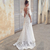 Every detail of this dress, made from the finest lace, radiates sophistication. The delicate V-neckline elongates the silhouette, while the flowing A-line skirt gracefully accentuates every movement, creating a mesmerizing aura as you glide down the aisle. Indulge in the whimsical charm of the batwing sleeves, adding a touch of playfulness and allure to your bridal ensemble.