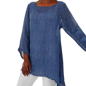 Introducing Esther, the epitome of relaxed elegance in women's fashion with this casual long linen shirt. Crafted from a blend of linen and polyester, this shirt is perfect for spring and summer, offering breathability and comfort. Featuring a round neckline, long sleeves, and an asymmetrical tunic design, Esther exudes effortless style and versatility. Enhance your warm-weather wardrobe with Esther, your essential choice for chic and relaxed outfits suitable for any casual outing.