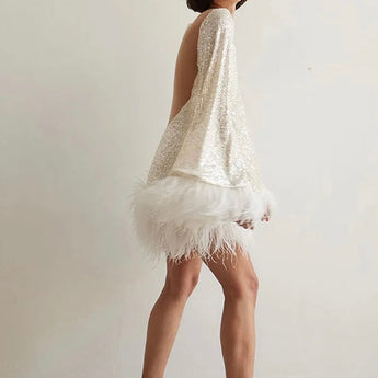 Shine at your next evening event in our Avencea Dress with Sequins and Feather Fringes at the Hem. This chic dress features shimmering sequins that reflect light in an enchanting manner, paired with delicate feather fringes at the hem for a dramatic flair. The sleek fit and backless design highlight your silhouette, making it a stunning choice for any celebration.