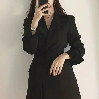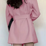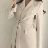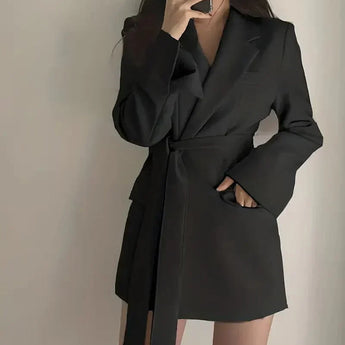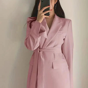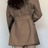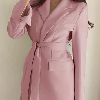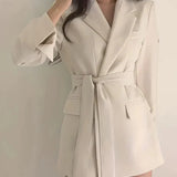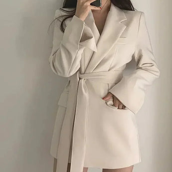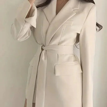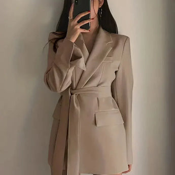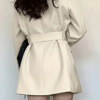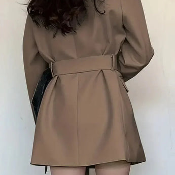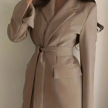 Features: A luxurious neutral beige tone that complements any outfit beautifully. Crafted from a premium fabric blend that feels soft and pleasant against the skin. Timeless double-breasted design with a modern twist. Wide notched lapels add a sophisticated touch to your silhouette. Long sleeves with adjustable straps at the wrists offer a customizable fit.