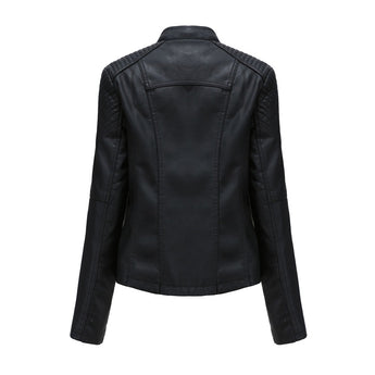 The jacket features a symmetrical zipper and a chic standing collar that looks particularly stylish when worn open. It includes several pockets that offer ample space for your hands, keys, and other small items.
