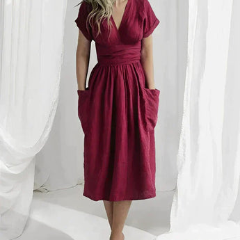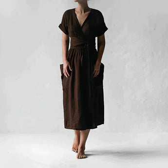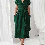 This stunning midi dress features a V-neckline, short kimono sleeves with cuffs, wrap belt, and practical side pockets. It is designed with a defined waist and a relaxed skirt silhouette that falls into a straight midi hem.