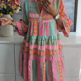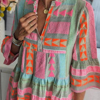 Wherever you go, this long dress will make you the center of attention and bring a smile to your face. Featuring a stylish mini dress design with a striking pattern, it is expertly crafted and includes a deep V-neck. Simply pair it with your favorite sandals!