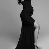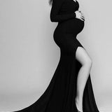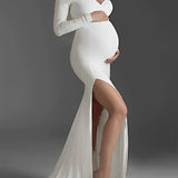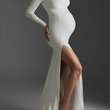 Avencea Maternity Photoshoot Baby Shower Dresses, Off-Shoulder, Side-Slit, Figure-Hugging Dresses, Floor-Length with Boat Neck and Long Sleeves Made of Cotton