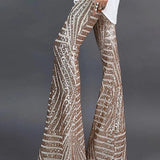This stylish pair of pants features a mid-rise, elastic waistband and a flared silhouette. Adorned with shimmering golden glitter and a unique print, these pants can be effortlessly paired with a blouse or bodysuit to complete your look.