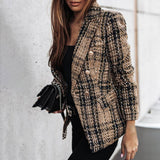 Enhance your autumn wardrobe with our chic checked blazer for women, offering a perfect blend of style and comfort. This blazer features a classic checked design, interwoven with fine sparkling accents that beautifully reflect light.