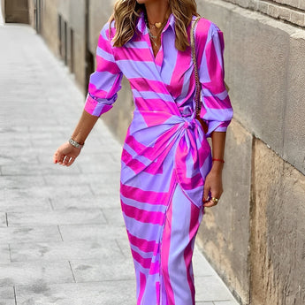 This chic maxi dress features a vibrant and majestic print with multicolored stripes, complemented by a V-neckline and long sleeves. This stunning piece is sure to turn heads - pair it with simple footwear like light brown sandal styles or classic black flats.
