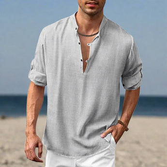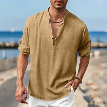 Designed with the modern man in mind, it features a stylish stand-up collar and a casual half-button placket, creating a relaxed yet refined vibe. The rolled-up sleeves are secured with a button tab, adding both functionality and an extra touch of casual sophistication.