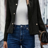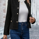 The jacket features a round collar and attractive golden buttons, providing a sophisticated look that can be dressed up or worn casually. With a button closure and a tailored fit, it creates a flattering silhouette, while the long sleeves offer extra comfort and style.