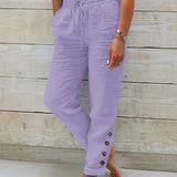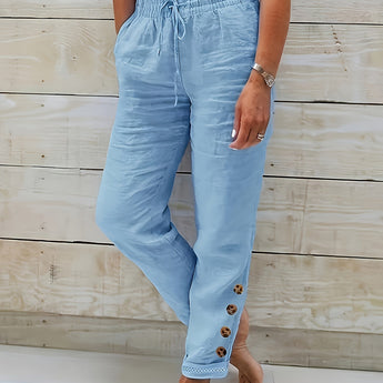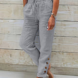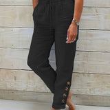 Presenting the Avencea - Tapered Lounge Pants, a classic piece for your wardrobe crafted for both flair and flexibility. These pants provide a relaxed yet polished appearance, featuring understated button details that lend sophistication to a traditional straight-leg design. Whether you're dressing casually for a day out or seeking a stylish option to unwind in, the Avencea pants are your essential choice for any time of the year.