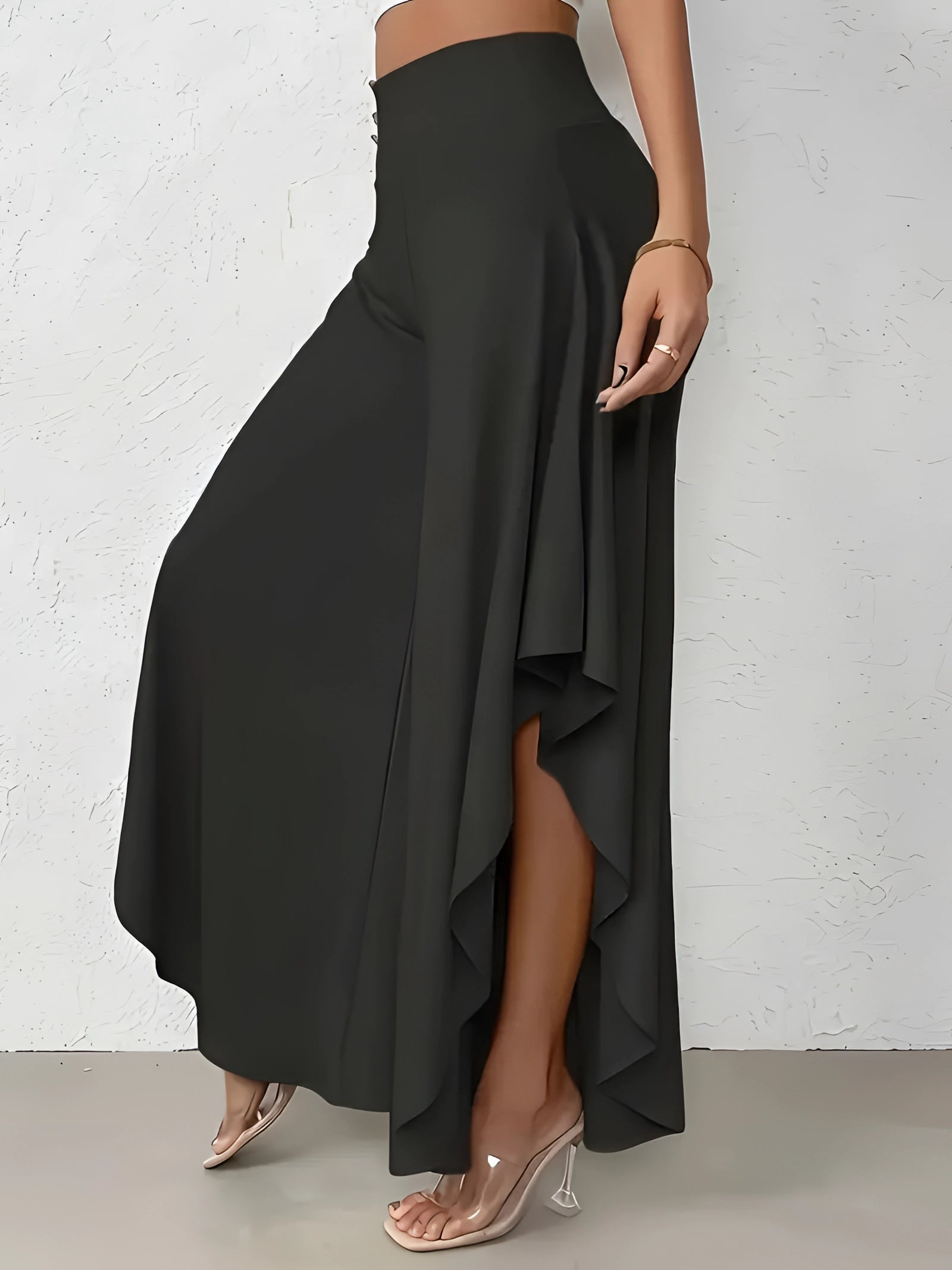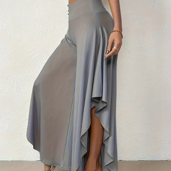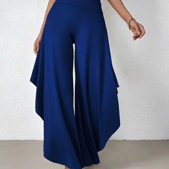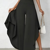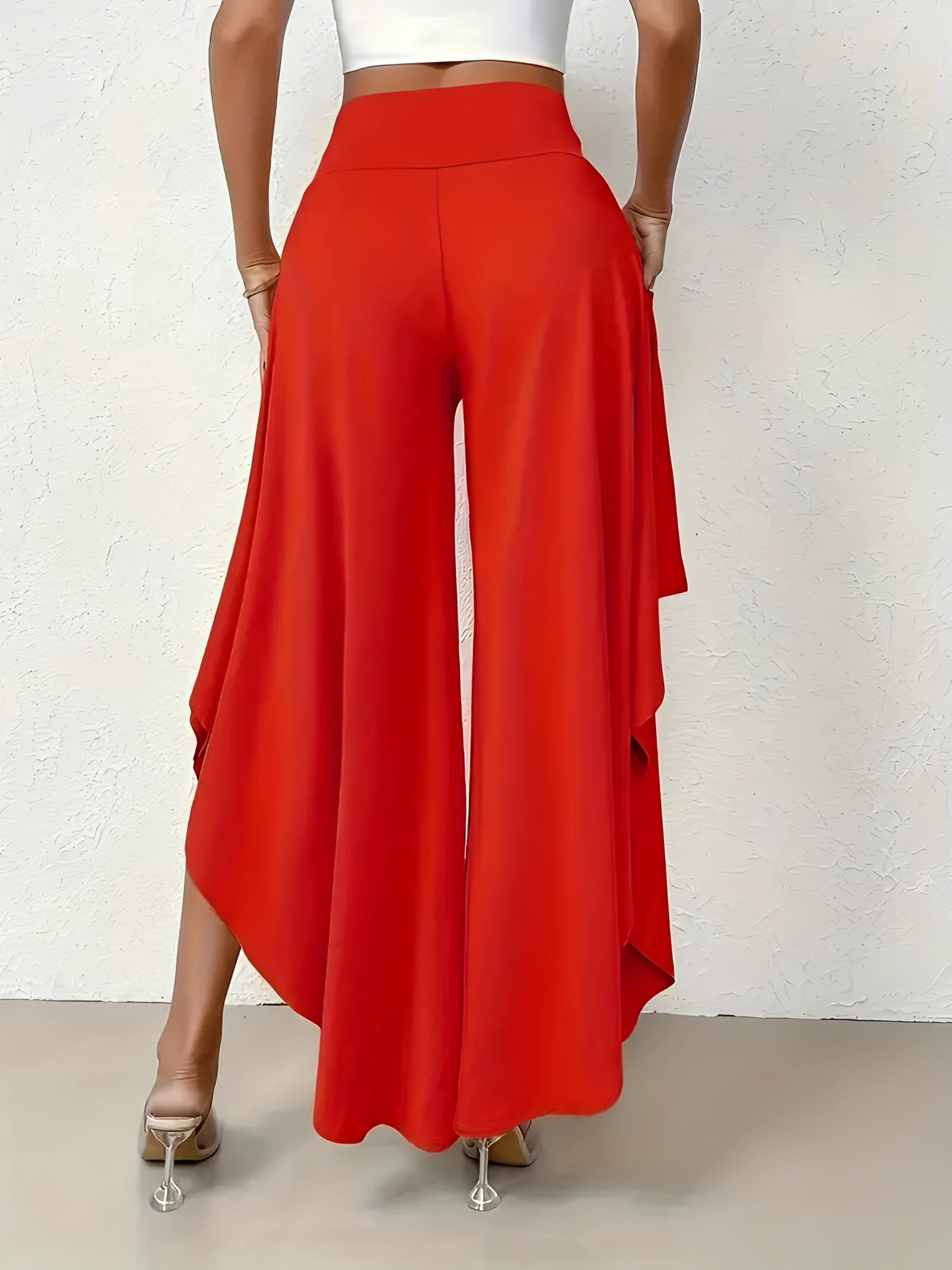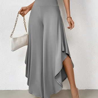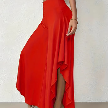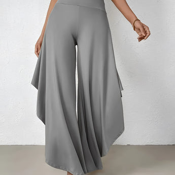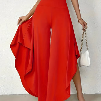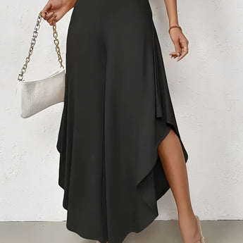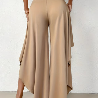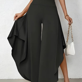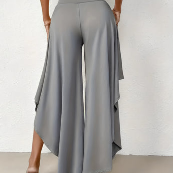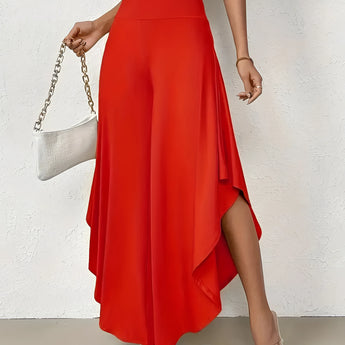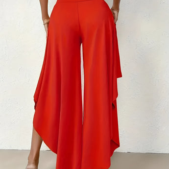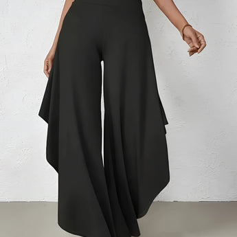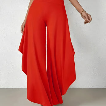 The Black Asymmetrical Palazzo Pants are a stunning addition to any wardrobe, offering a unique blend of style and comfort. These elegant wide-leg draped trousers are available in a variety of colors including Black, Persimmon, Red, Blue, and Gray, and come in sizes ranging from XS to XL, ensuring a perfect fit for everyone. Crafted from a lightweight and breathable material, these pants are ideal for the warmer months of spring and summer. The high-waisted design features an exclusive ruffled trim and a loose, relaxed cut that creates a fluid and elegant silhouette. The solid color and asymmetrical detail add a touch of style to casual wear, making these pants a versatile choice for any occasion. Whether you're dressing up for a night out or keeping it casual for a day in the sun, these pants offer effortless comfort and style. Additionally, the product comes with the benefit of free shipping, making it an even more attractive option for fashion-forward individuals. The combination of a high waist, wide-leg design, and asymmetrical hemline makes these pants a standout piece that is both fashionable and functional, perfect for those dry, sunny days.