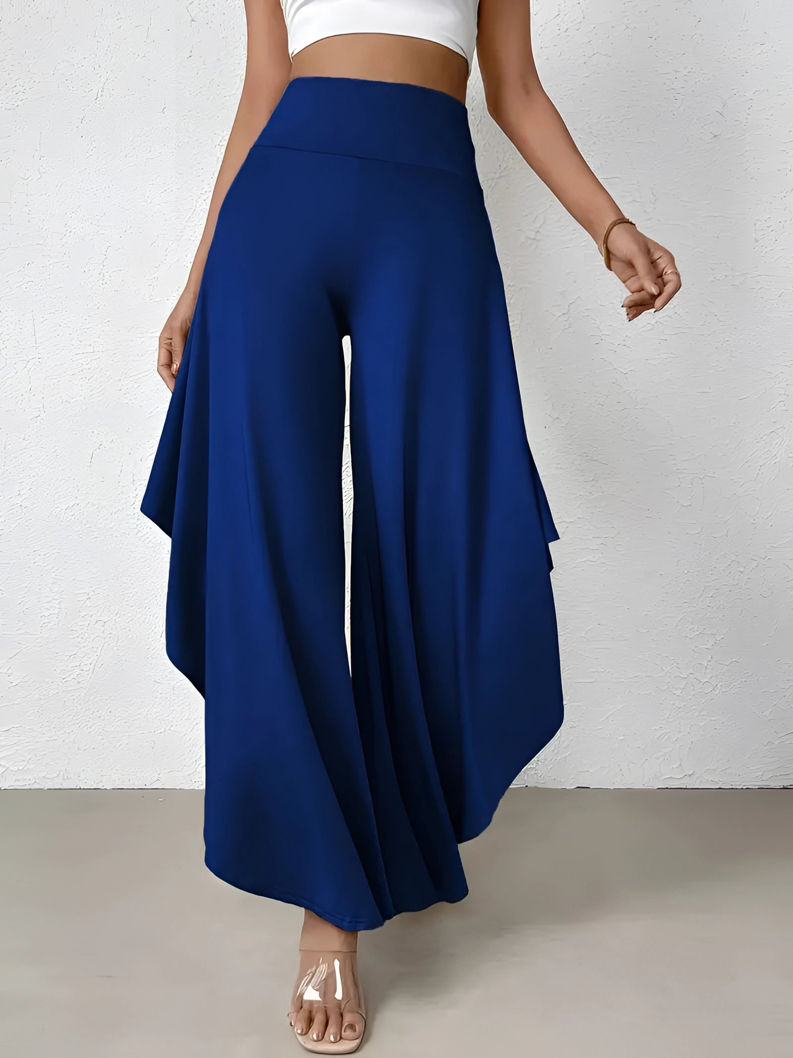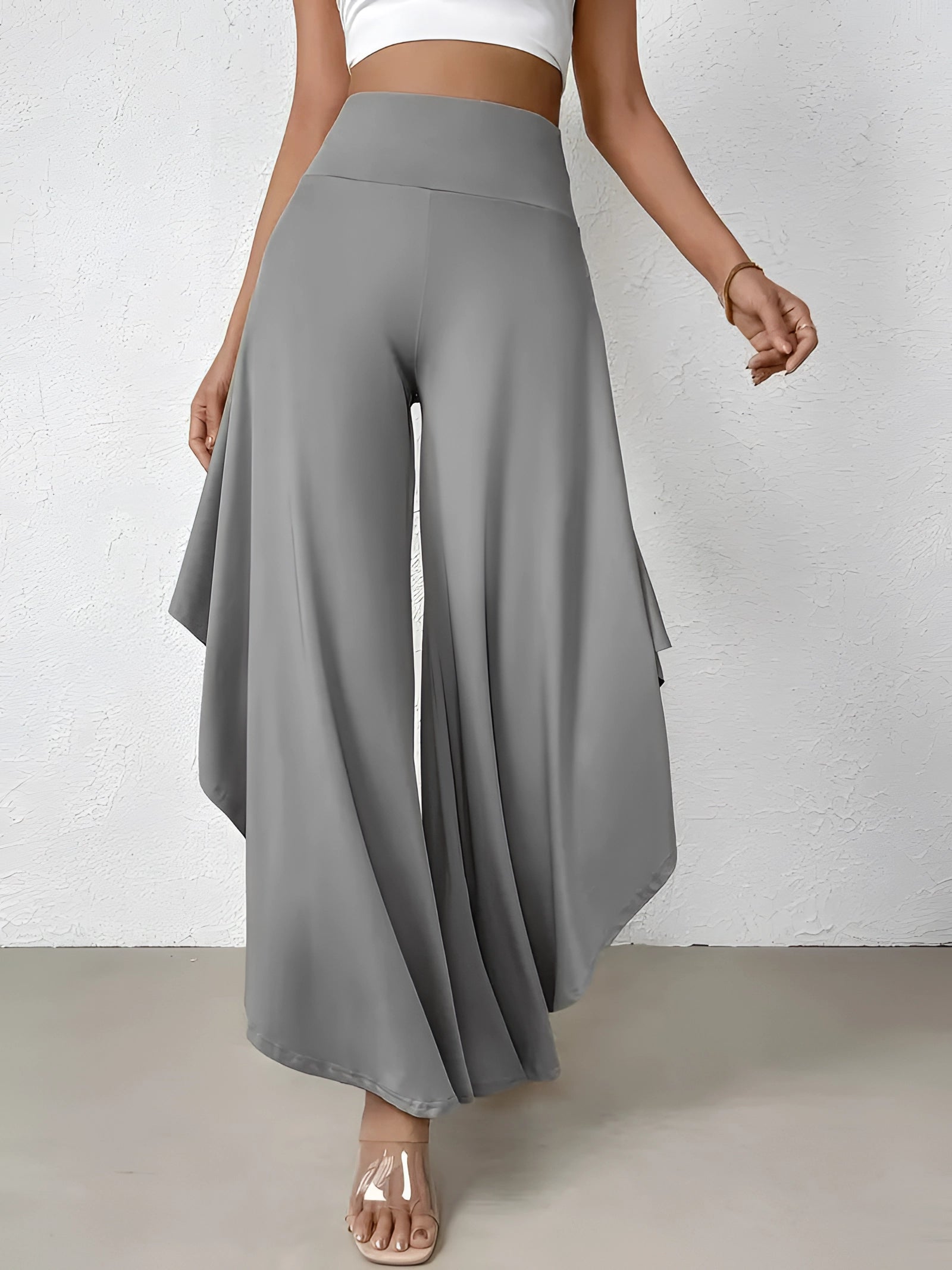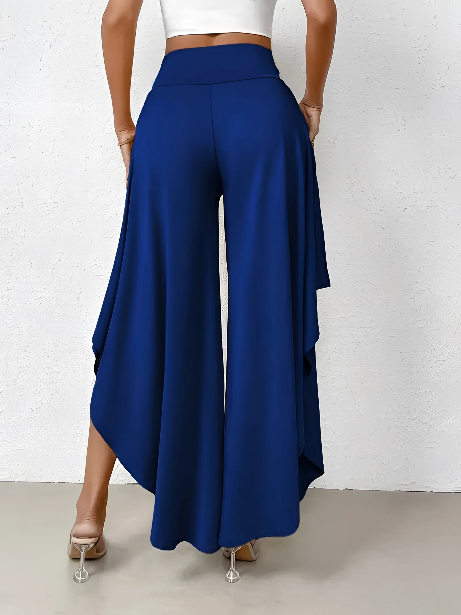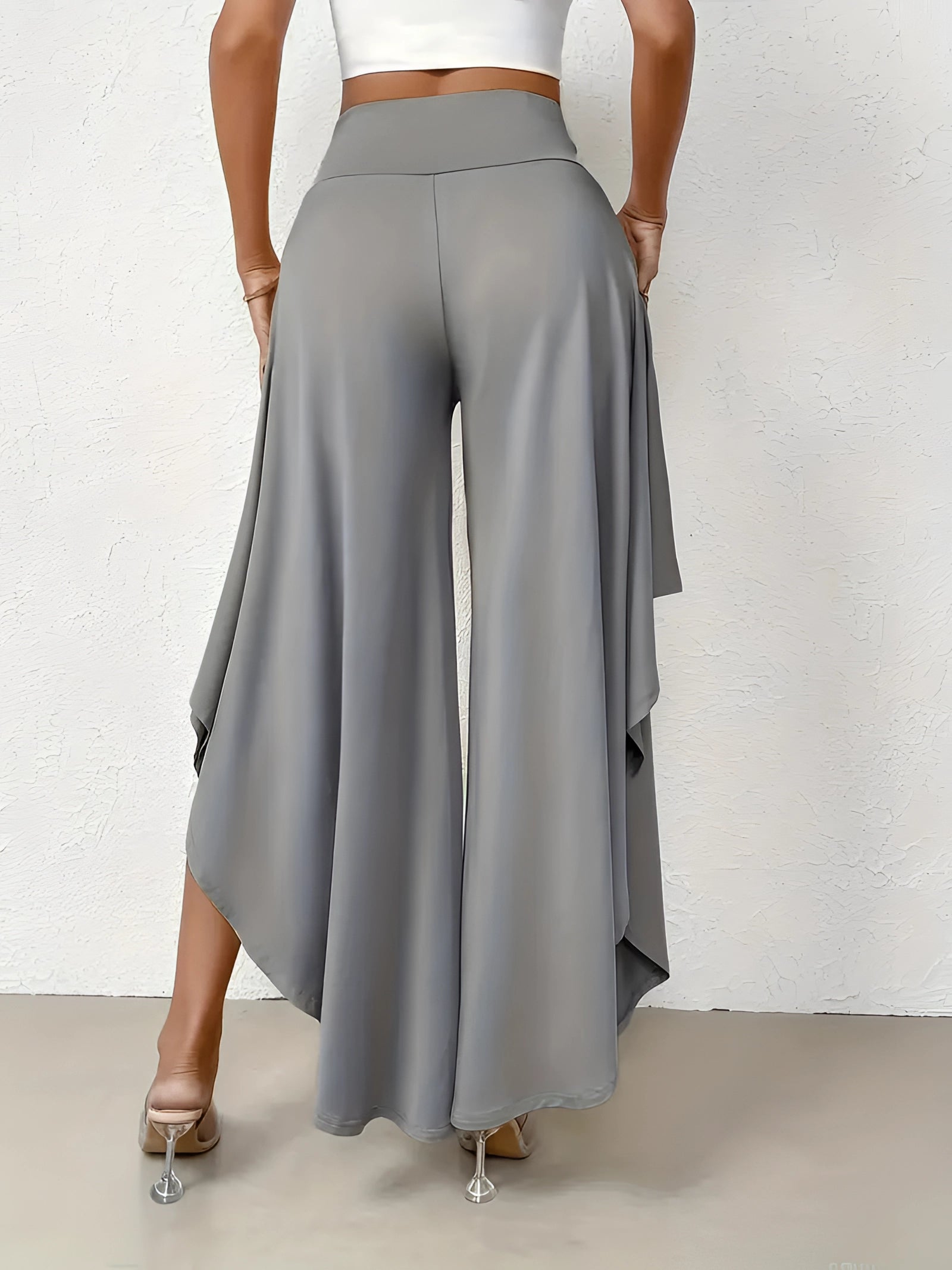 The Black Asymmetrical Palazzo Pants are a stunning addition to any wardrobe, offering a unique blend of style and comfort. These elegant wide-leg draped trousers are available in a variety of colors including Black, Persimmon, Red, Blue, and Gray, and come in sizes ranging from XS to XL, ensuring a perfect fit for everyone. Crafted from a lightweight and breathable material, these pants are ideal for the warmer months of spring and summer. The high-waisted design features an exclusive ruffled trim and a loose, relaxed cut that creates a fluid and elegant silhouette. The solid color and asymmetrical detail add a touch of style to casual wear, making these pants a versatile choice for any occasion. Whether you're dressing up for a night out or keeping it casual for a day in the sun, these pants offer effortless comfort and style. Additionally, the product comes with the benefit of free shipping, making it an even more attractive option for fashion-forward individuals. The combination of a high waist, wide-leg design, and asymmetrical hemline makes these pants a standout piece that is both fashionable and functional, perfect for those dry, sunny days.