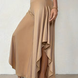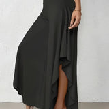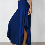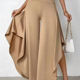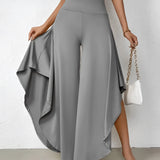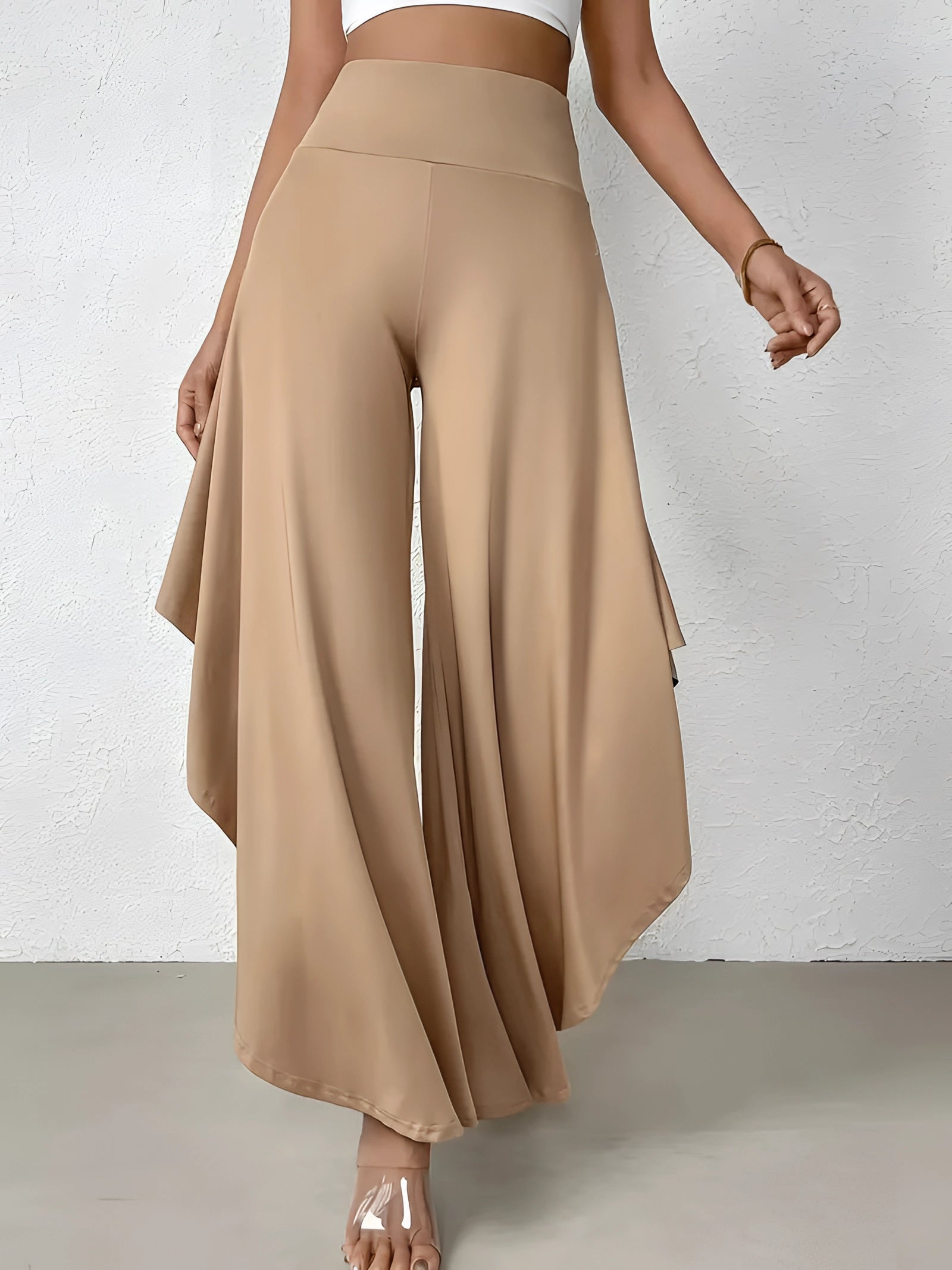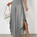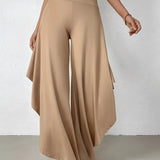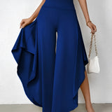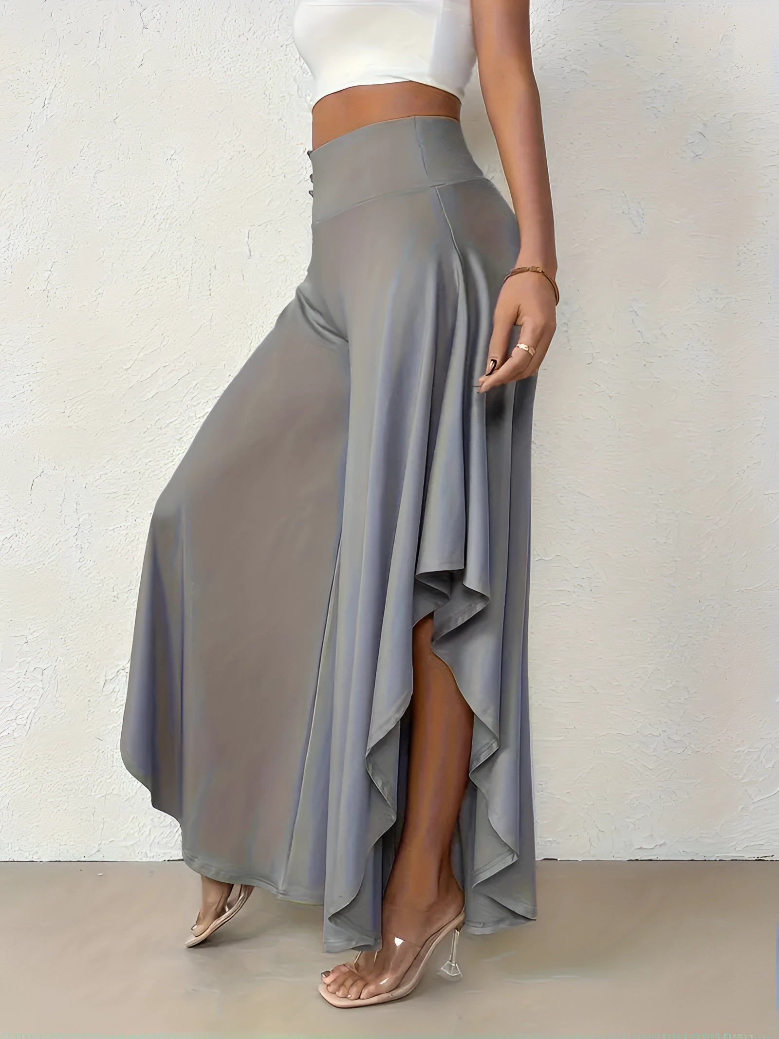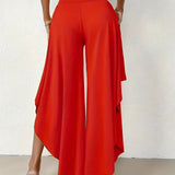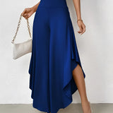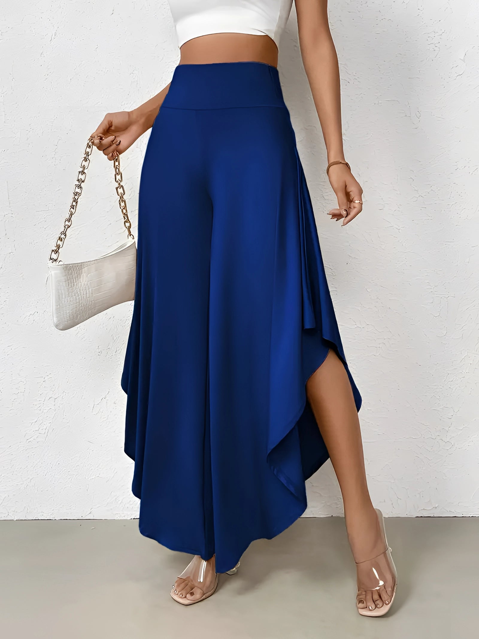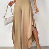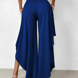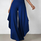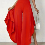 The Black Asymmetrical Palazzo Pants are a stunning addition to any wardrobe, offering a unique blend of style and comfort. These elegant wide-leg draped trousers are available in a variety of colors including Black, Persimmon, Red, Blue, and Gray, and come in sizes ranging from XS to XL, ensuring a perfect fit for everyone. Crafted from a lightweight and breathable material, these pants are ideal for the warmer months of spring and summer. The high-waisted design features an exclusive ruffled trim and a loose, relaxed cut that creates a fluid and elegant silhouette. The solid color and asymmetrical detail add a touch of style to casual wear, making these pants a versatile choice for any occasion. Whether you're dressing up for a night out or keeping it casual for a day in the sun, these pants offer effortless comfort and style. Additionally, the product comes with the benefit of free shipping, making it an even more attractive option for fashion-forward individuals. The combination of a high waist, wide-leg design, and asymmetrical hemline makes these pants a standout piece that is both fashionable and functional, perfect for those dry, sunny days.