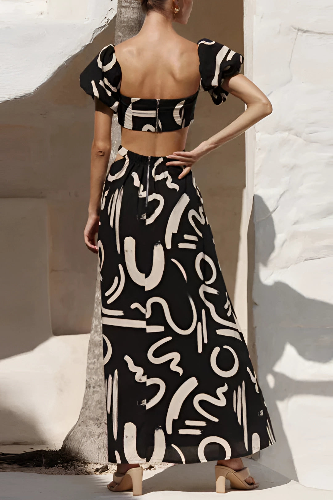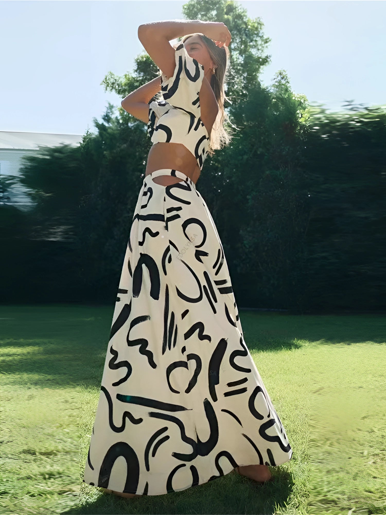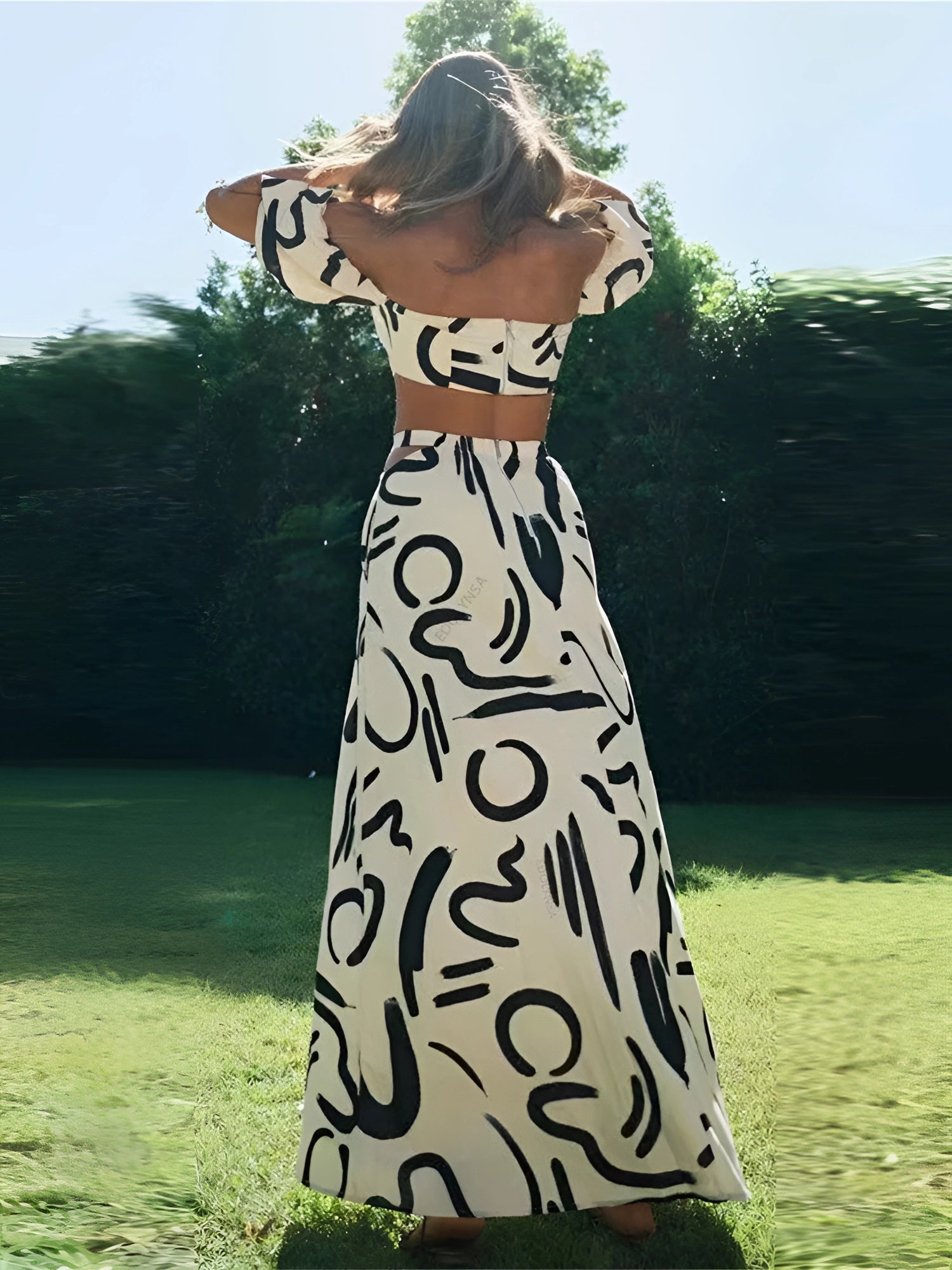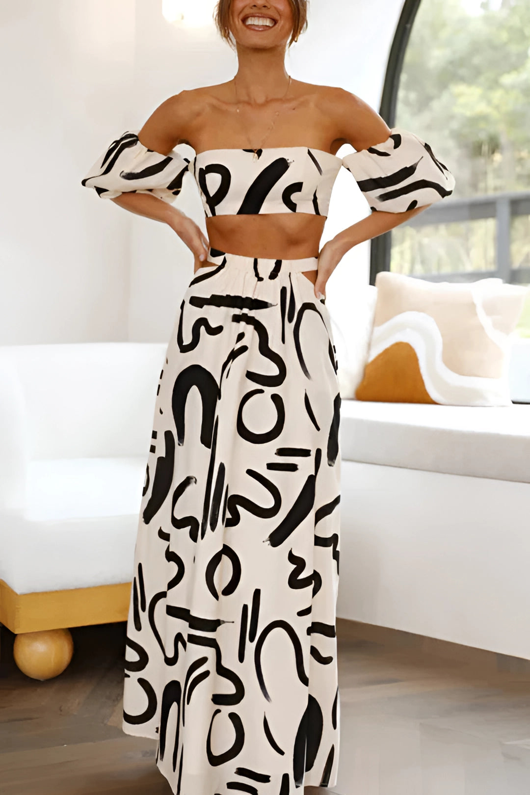 The Black & White Abstract Two-Piece Dress, featuring an off-shoulder top and palazzo pants, is a stunning ensemble that combines elegance with a modern twist. This set, known as the Allegra Doodle, is designed to offer a bohemian flair with its printed off-shoulder top and maxi skirt with unique cut-out pockets. The top is fluid and adorned with playful ruffles, complemented by a captivating off-shoulder neckline that adds a touch of sophistication. The maxi skirt, reaching gracefully to the floor, is not only stylish but also practical with its exclusive pocket design. Crafted from premium quality fabric, this two-piece set ensures exceptional comfort and breathability, making it ideal for various occasions. Available in a range of colors including White, Nero, and Blu Navy, and sizes from S to XL, it provides a perfect fit for every style preference. Whether you're dressing up for a special event or looking to enhance your everyday wardrobe, the Allegra Doodle set is versatile enough to be paired with your favorite accessories for a chic and fashionable look. Embrace the allure of this exquisite set and elevate your wardrobe with its unique design and superior comfort.