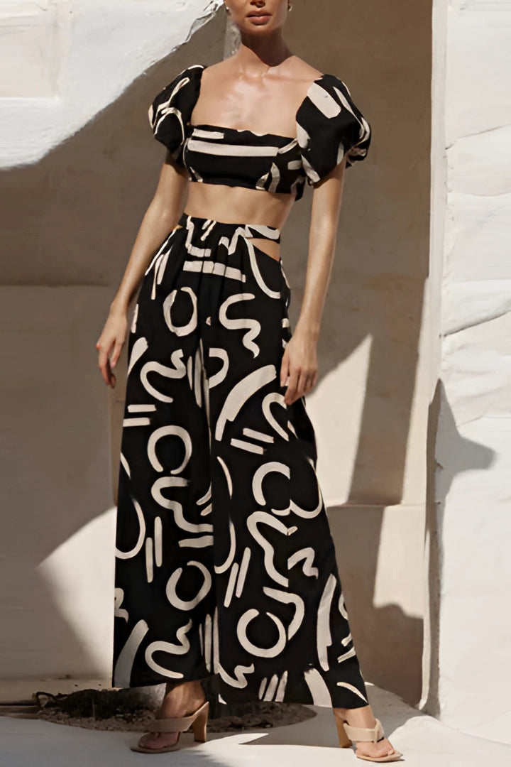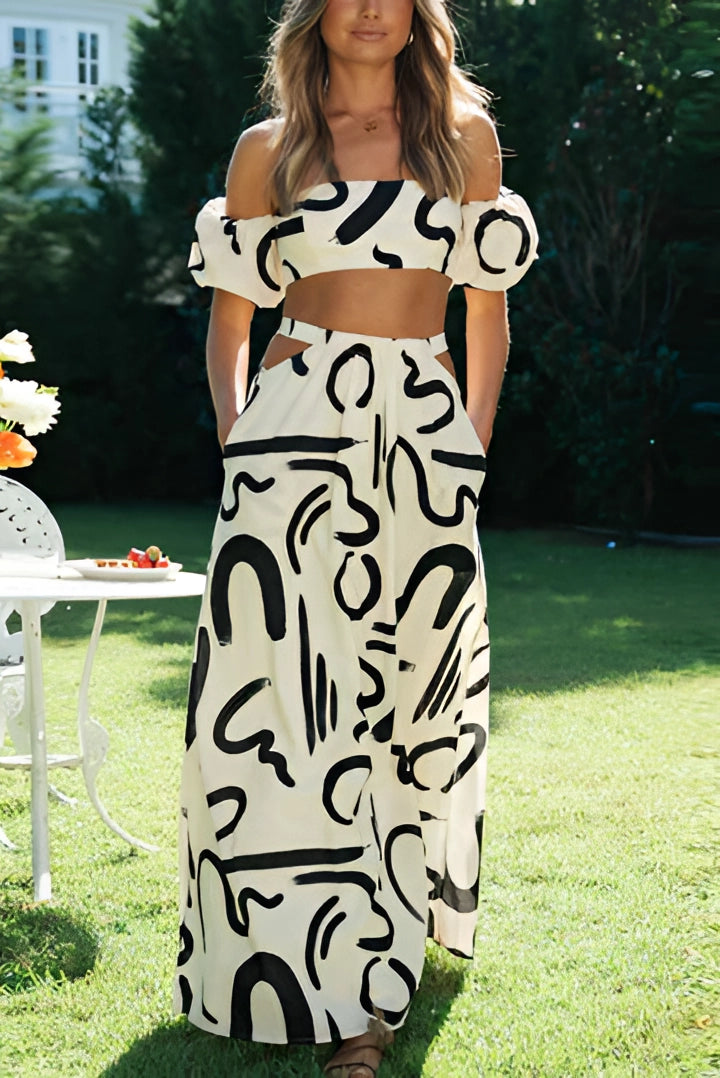 1 - Black & White Abstract Two-Piece Dress - Off-Shoulder Top & Palazzo Pants |