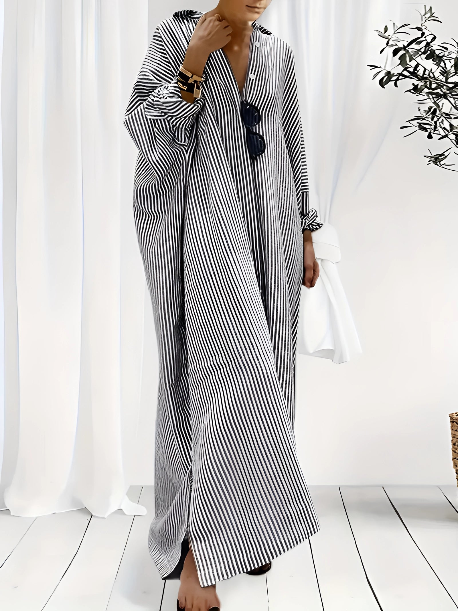 1 - Black & White Striped Maxi Dress - Long Sleeve, Breezy Beachwear |