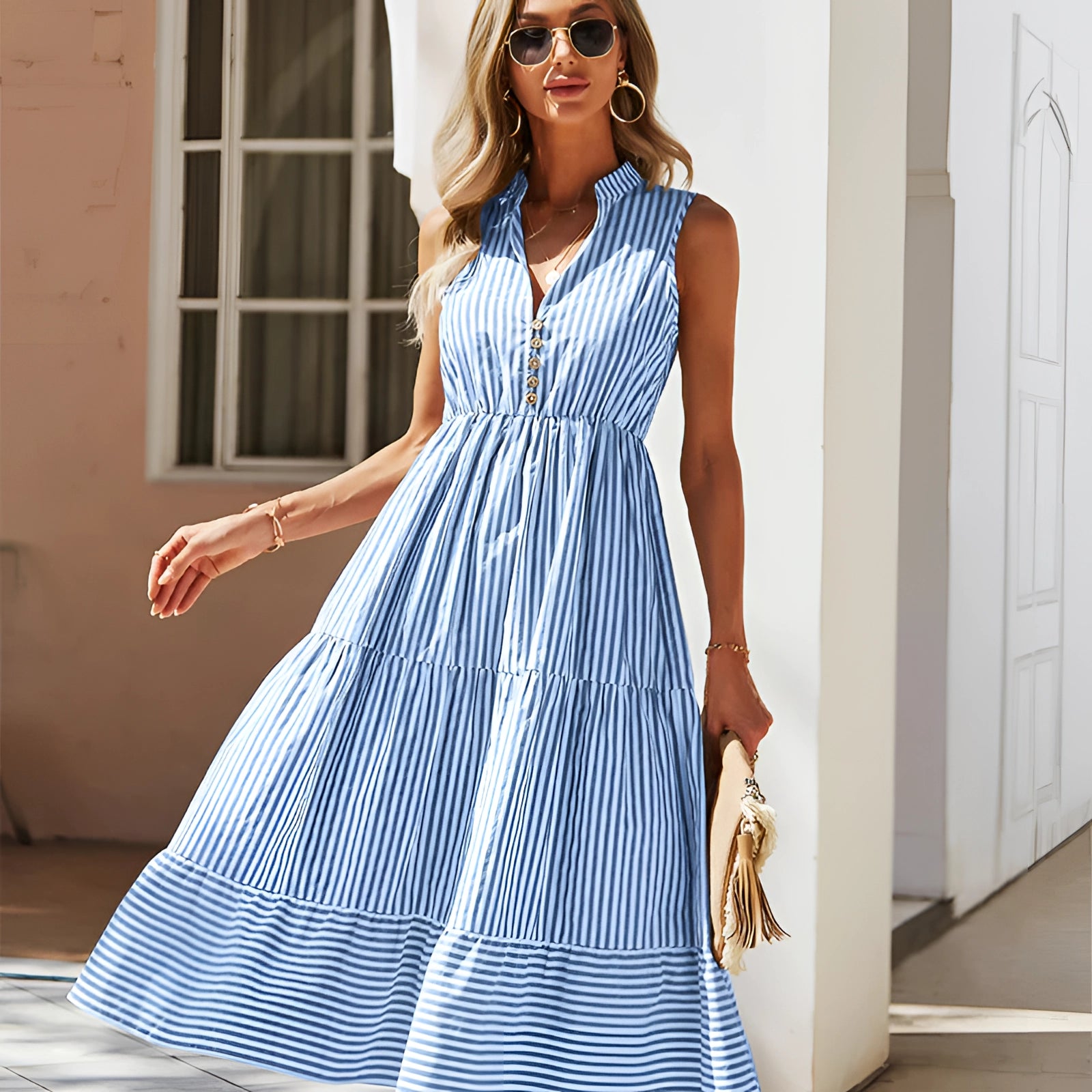 1 - Blue Striped Sleeveless Midi Dress - V-Neck Button Front Sundress |