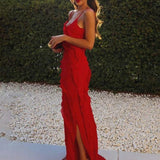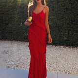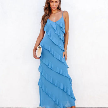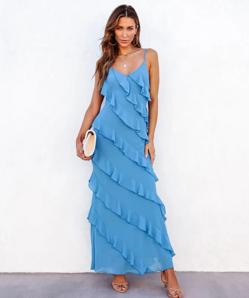 The stylish maxi dress featuring a ruffled back and V-neckline is ideal for any occasion. The intricate back design and deep neckline add a feminine touch, making this dress a standout choice. This dress exudes chic and elegance.