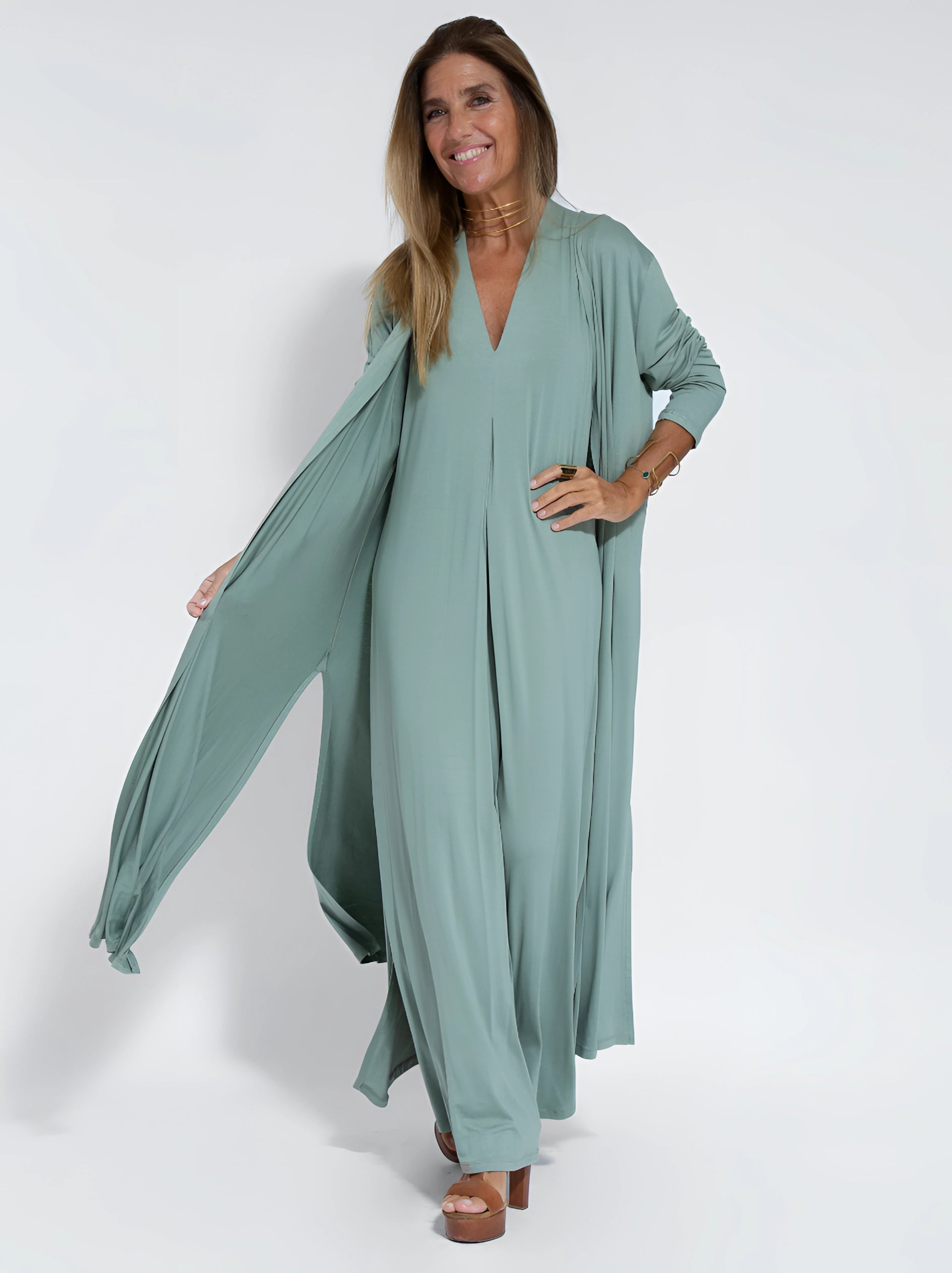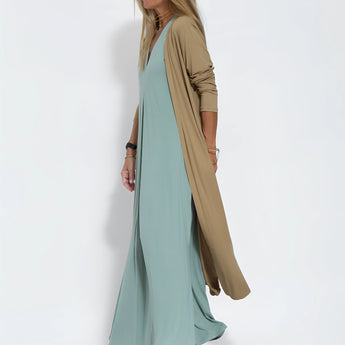 Introducing the Elegant V-Neck Sleeveless Maxi Dress, a luxurious piece of evening wear that seamlessly combines sophistication and comfort. This exquisite dress, known as Saige, is crafted from high-quality fabrics that envelop you in refinement, making it an ideal choice for both formal events and casual gatherings. The dress features an impeccable design and a flattering silhouette that ensures you exude confidence wherever you go. Available in a variety of combinations, including black, white, brown, and turquoise dresses paired with matching or contrasting vests, this dress offers versatility and style. The size options range from S to 2XL, accommodating a wide range of body types. The dress is designed to highlight your style and leave a lasting impression, inviting you into a world where fashion becomes an unforgettable experience. Saige is where elegance meets timeless beauty, making it a must-have addition to your wardrobe. The dress comes with a detailed size chart to ensure the perfect fit, and while there may be slight variations in color and size due to camera angles and lighting, the overall quality and design remain impeccable. Included with your purchase is one Saige elegant maxi dress, ready to elevate your fashion game to new heights.