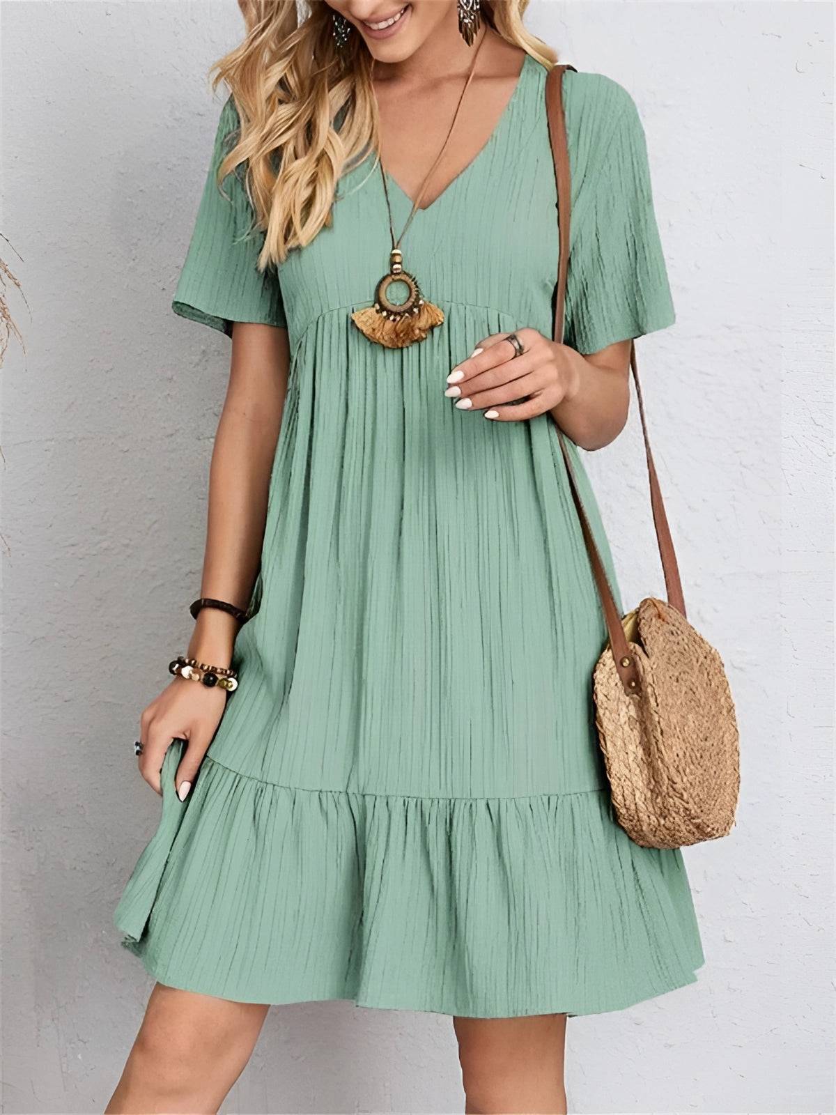 Step into timeless elegance with the Green Pleated Midi Dress, a short sleeve summer casual dress that embodies classic beauty. This luxurious retro-inspired dress features a V-neck design that harks back to the charming fashions of the past, offering a blend of retro aesthetics and modern comfort. Meticulously designed to fit all body shapes, it exudes an allure and timeless elegance that makes it a perfect addition to any wardrobe. Available in a variety of colors including Red, Green, Nero, Brown, Pink, Light green, and Viola, and sizes ranging from S to 3XL, this dress caters to diverse style preferences and body types. The high-quality, breathable fabric ensures all-day comfort with a soft feel against the skin, making it ideal for any occasion. Whether attending cocktail parties, weddings, or simply adding a touch of retro style to your daily look, this dress is versatile and elegant. Pair it with high heels or flats to create a casual or formal look. Its captivating silhouette and timeless design make it a wardrobe staple that never goes out of style. Don't miss out on this incredible V-Clean Vine dress that promises to keep you looking back with admiration. Order now and add this versatile piece to your collection, ensuring you feel confident and elegant no matter the occasion.