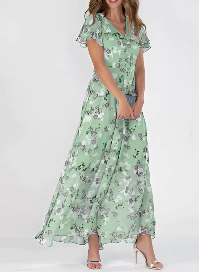 The Light Blue Ruffle Sleeve Floral Maxi Dress is a stunning chiffon summer gown that embodies elegance and femininity. This dress is available in two beautiful colors, Light Blue and Green, and comes in a wide range of sizes from S to 3XL, ensuring a perfect fit for every body type. Crafted from high-quality fabric, this dress features an eye-catching mix of colors and patterns, making it a truly breathtaking piece. The intricate floral details add a touch of femininity and elegance, while the comfortable fit ensures you can wear it with confidence. Whether you're heading out for a casual day or attending a special occasion, this floral maxi dress is a must-have for any fashion-forward woman. Its versatility and style make it an ideal choice for various events, allowing you to express your unique sense of fashion. With its ruffle sleeves and flowing maxi length, this dress offers a graceful silhouette that flatters any figure. Choose from a variety of sizes and colors to find your perfect match and embrace the enchanting allure of this floral gown.