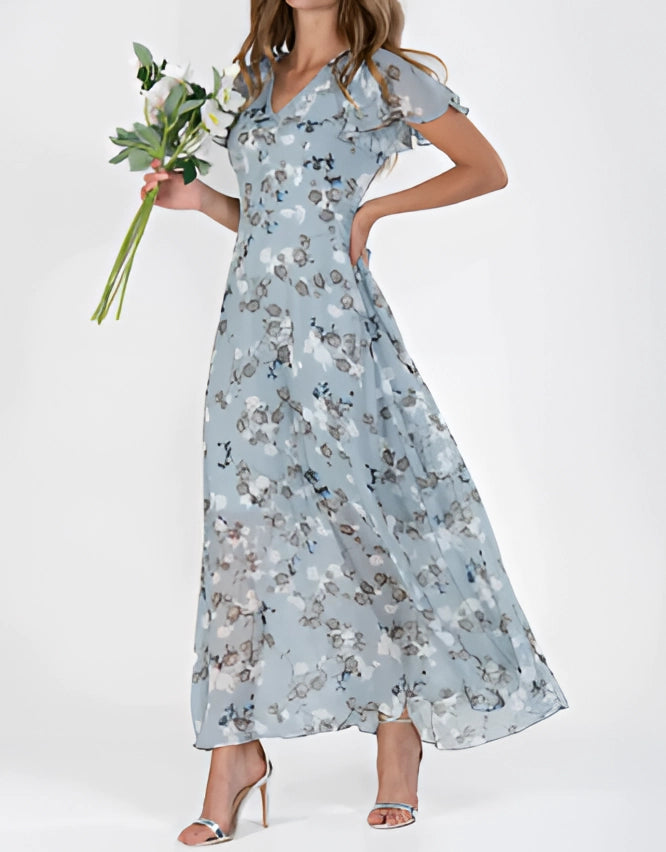 1 - Light Blue Ruffle Sleeve Floral Maxi Dress - Chiffon Summer Gown |