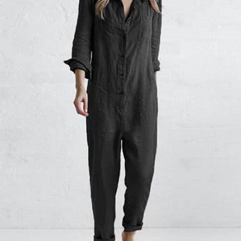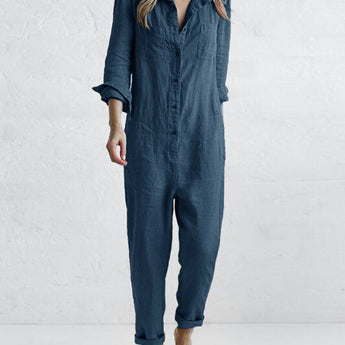 This versatile garment made from 100% cotton seamlessly blends comfort with style. Featuring a relaxed fit and long sleeves, it is perfect for any occasion, whether you're enjoying a casual day outdoors or attending an evening event. The jumpsuit includes a classic button closure and an array of pockets, such as two chest pockets, two side pockets, and two back pockets, marrying functionality with a chic design. The long-sleeve jumpsuit from Avencea is easy to maintain and can be washed in cold water in a machine. It is a must-have piece for any wardrobe.