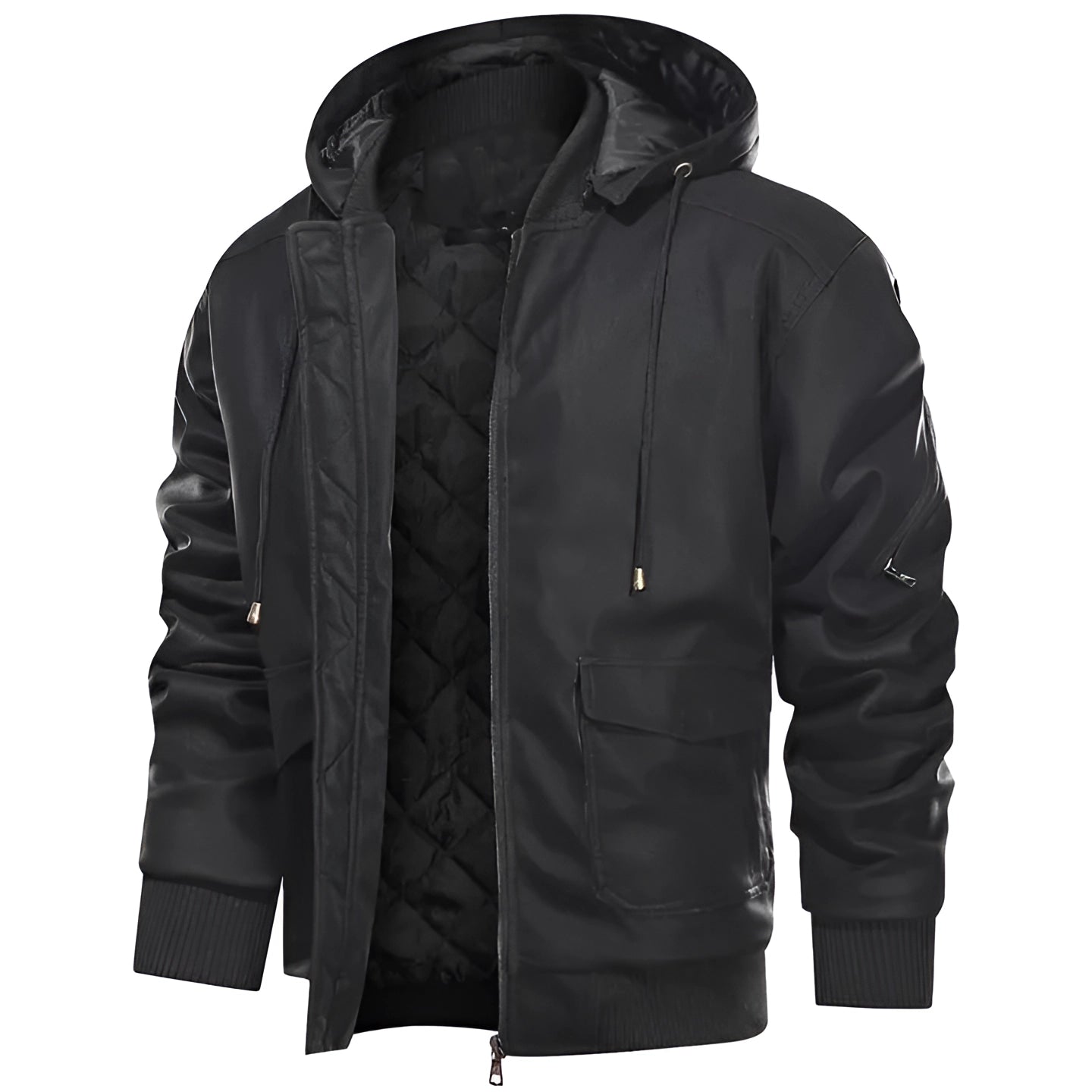 1 - Men's Black Hooded Leather Jacket - Quilted Biker Style |