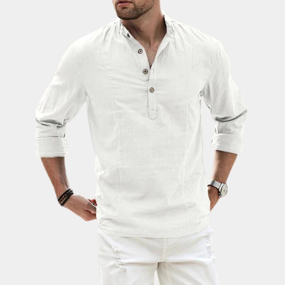 The Men's Olive Green Linen Blend Long Sleeve Mandarin Collar Shirt is the perfect addition to elevate your wardrobe. This shirt is crafted from a breathable and comfortable linen blend material, making it an ideal choice for warm weather. The natural fabric feels soft against the skin and provides a cooling effect, ensuring comfort even on the hottest days. Its lightweight and airy nature make it a summer essential. The shirt features a stylish mandarin collar and a beautiful button closure, with sleeves that can be easily rolled up for a more casual look. The design exudes a casual chic vibe and offers versatile styling options. Pair it with shorts for a relaxed beach look or with trousers for a chic and professional appearance. Available in a range of colors including olive green, beige, gray, peach, and white, and sizes from S to 3XL, this shirt caters to various style preferences and body types. The breathable, lightweight, and stylish attributes of this shirt ensure you remain comfortable and fashionable throughout the summer months. Embrace summer elegance with this linen shirt and experience a season full of fashionable adventures. Order now to enjoy the ultimate combination of fashion and comfort.