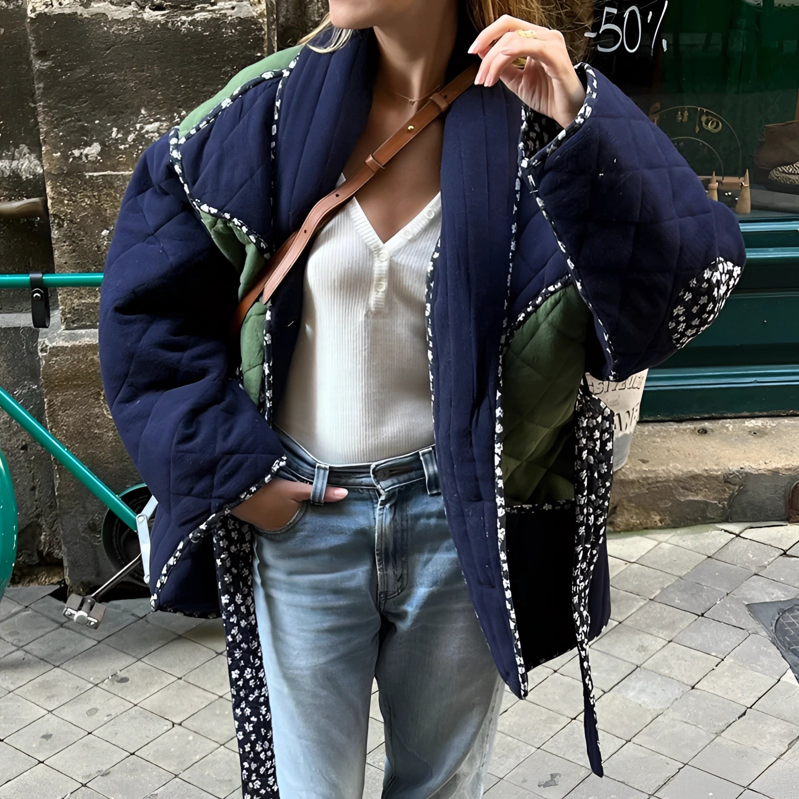 The Reversible Navy Blue Quilted Kimono Jacket, embodying an urban boho style, is a versatile and stylish addition to any winter wardrobe. This jacket, known as the Kivandra, is designed to provide optimal warmth and protection against the cold, making it an essential piece for chilly days. Its unique reversible feature allows for two distinct looks in one garment, enhancing its versatility. The jacket's standout feature is its color-block design, which adds a trendy and modern touch, ensuring you stay fashionable even in the coldest weather. The adjustable belt is another key feature, allowing you to cinch the waist for a flattering, feminine silhouette, while also ensuring a perfect fit. Additionally, the jacket is equipped with generous pockets, ideal for securely storing small items, adding practicality to its stylish design. Available in sizes S, M, L, and XL, this jacket caters to a range of body types, ensuring everyone can enjoy its warmth and style. The Kivandra jacket is not just about aesthetics; its warm padding is perfect for cold winter days, making it a must-have for anyone looking to combine comfort with style. Whether you're heading out for a casual day or dressing up for an evening out, this jacket is sure to keep you warm and stylish.