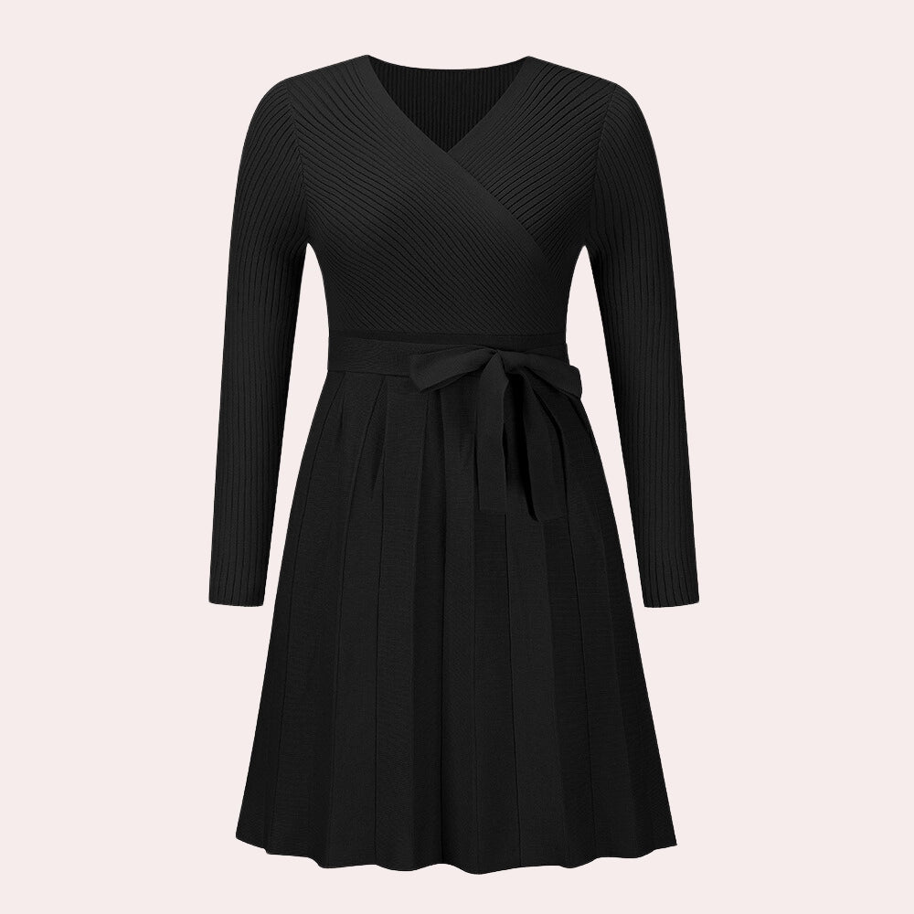 Ribbed Black Wrap Dress - Long Sleeve V-Neck Skater Style