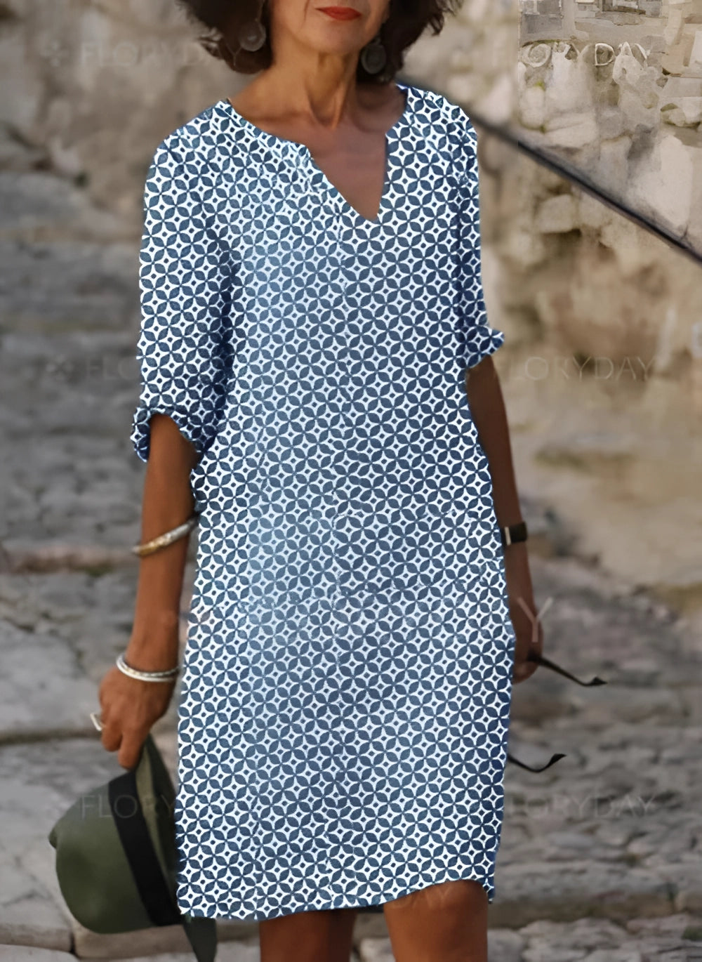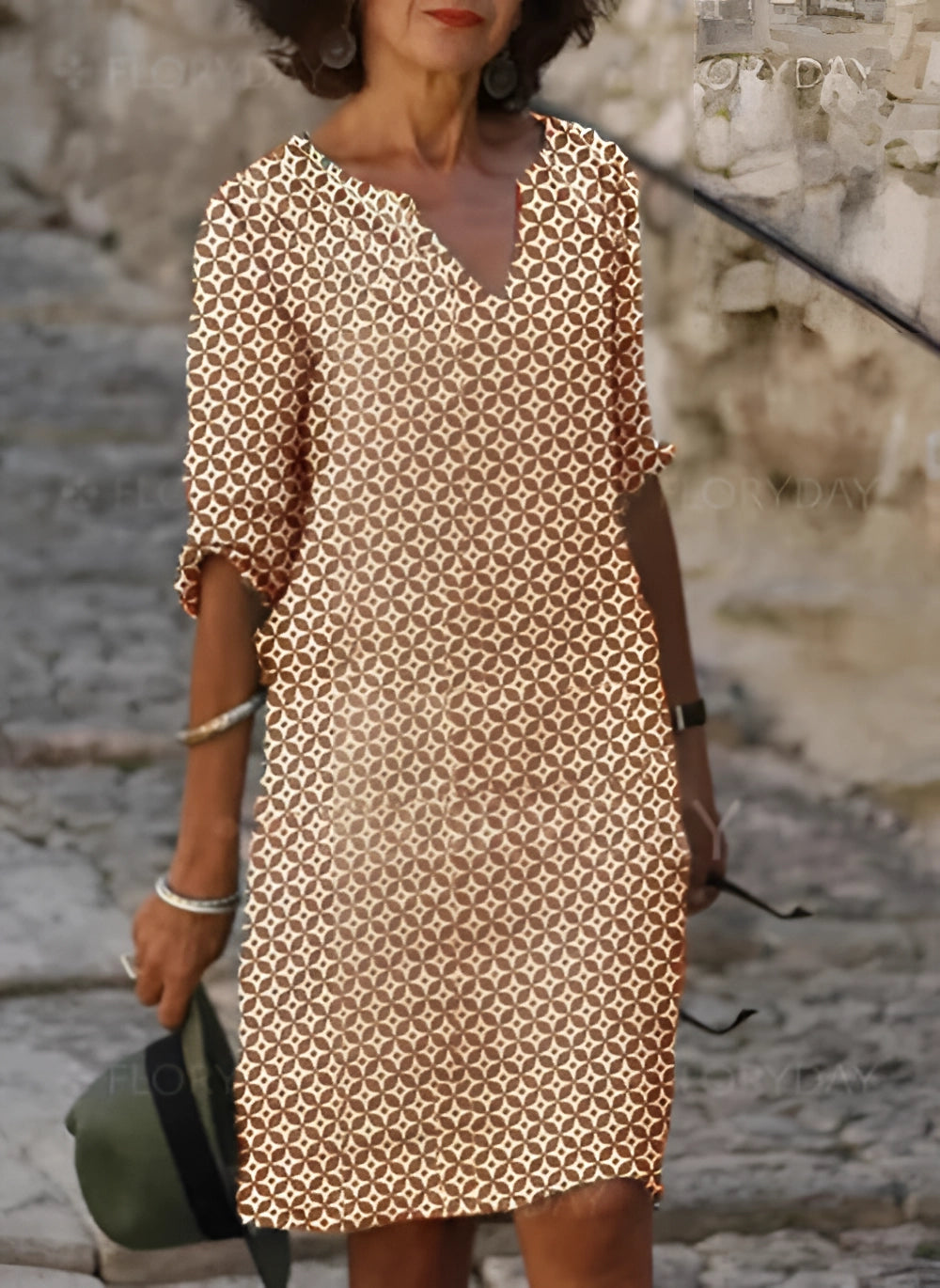 1 - V-Neck Geometric Print Loose Fit Summer Dress, 3/4 Sleeve, Green & White |