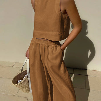 Discover sophistication and comfort with the two-piece set from Avencea, your ideal ensemble for any event. This set features a chic, sleeveless crop top that pairs effortlessly with the matching pants. The pants offer a relaxed fit with an elastic waistband for maximum comfort and adaptability. Both components are crafted from lightweight, breathable fabric, ensuring a luxurious feel so you can look great and feel at ease anywhere. The Avencea two-piece set is versatile and stylish, perfect for dressing up casually or elegantly.