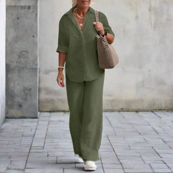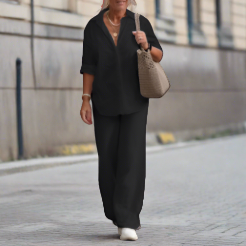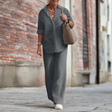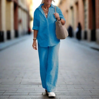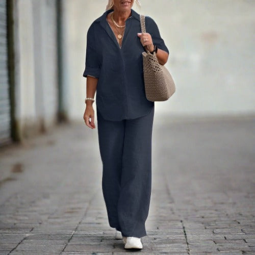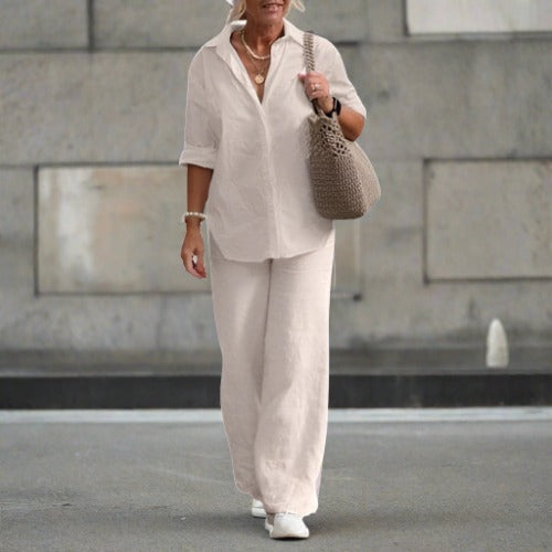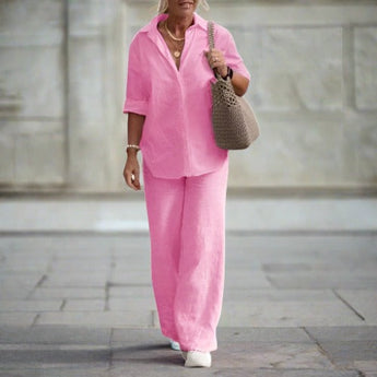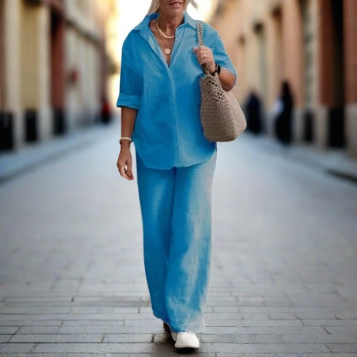 The loose, breathable shirt ensures you stay cool and stylish on warm, sunny days. The matching straight-leg pants can be effortlessly paired with flats or sneakers, providing a versatile look.