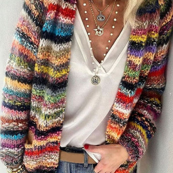 The vibrant knitted cardigan seamlessly blends ultimate comfort with chic style. This eye-catching striped cardigan features a bold design and a relaxed, easy-going fit that is both cozy and fashionable. Perfect for infusing a fresh and colorful vibe into any outfit, whether you’re lounging at home or heading out for an adventure. The soft and warm fabric makes it an excellent choice for cooler days.
