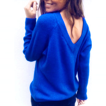 1 - Backless Royal Blue V-Neck Sweater - Women's Fall Fashion Knit