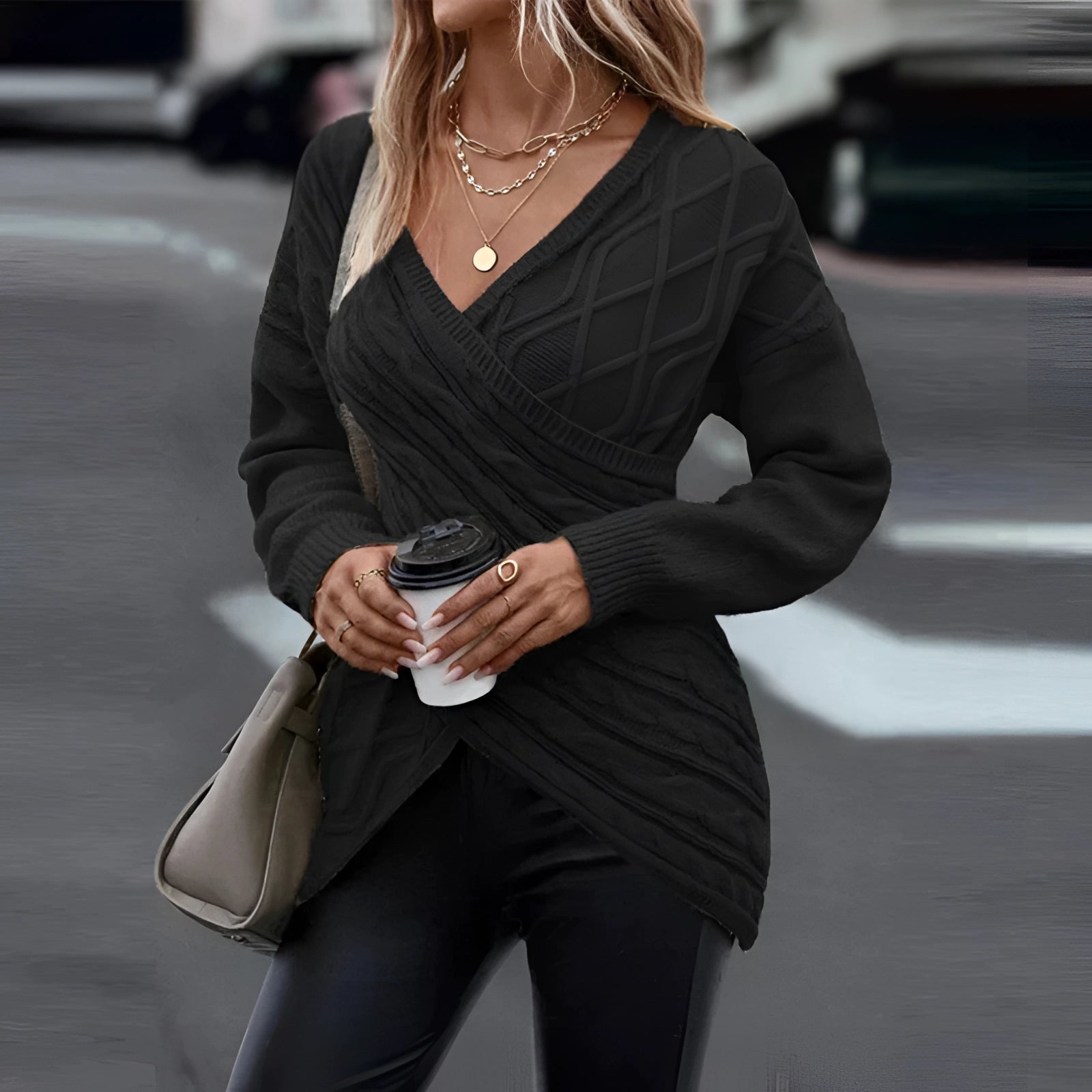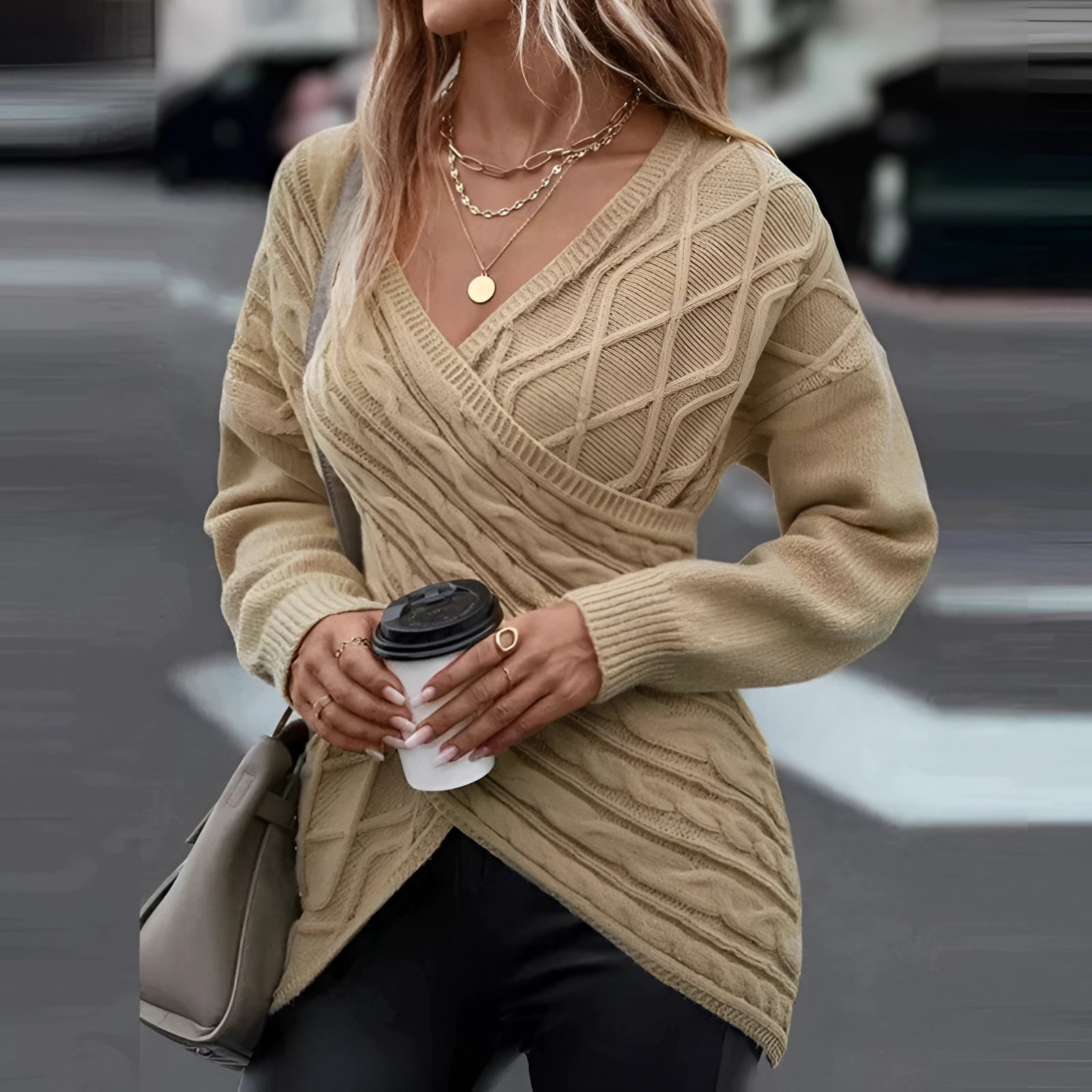 The Beige Crew Neck Sweater for women is a quintessential piece for fall fashion, offering a blend of style and comfort that is perfect for the cooler months. Available in a variety of colors including Khaki, Orange, Black, Gray, and Pink, this sweater caters to diverse style preferences. It comes in sizes ranging from S to XXL, ensuring a fit for every body type. The sweater is designed with a crew neck and features a modern asymmetrical cut, which adds a touch of elegance to its casual appeal. Made from high-quality knit fabric, it provides warmth and a soft, comfortable feel, making it ideal for chilly winter days. The Olivia wrap knit pullover is not just a sweater; it's a statement piece that enhances any outfit with its sophisticated design. Its versatility allows it to be easily styled for various occasions, whether you're dressing up for a night out or keeping it casual for a day at home. The unique selling points of this sweater include its asymmetrical cut that offers a fashionable look, the warmth and comfort provided by the soft knit material, and its ability to be paired effortlessly with different wardrobe pieces. This makes the Olivia sweater a must-have addition to your wardrobe, combining elegance with a laid-back style that is both chic and practical.