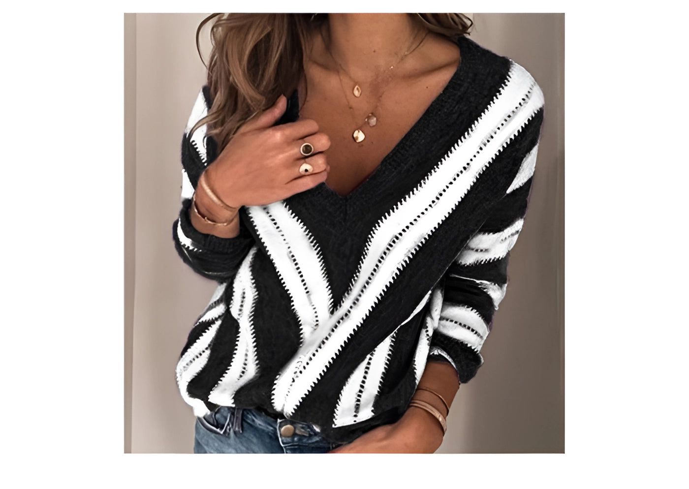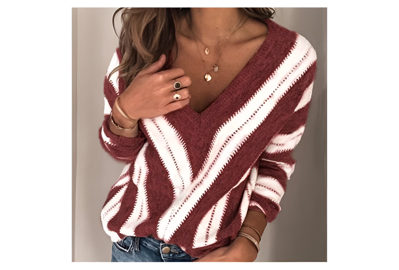 1 - Brown White V-Neck Striped Knit Sweater - Women's Casual Pullover |