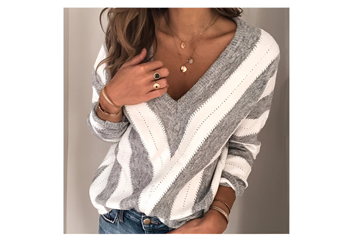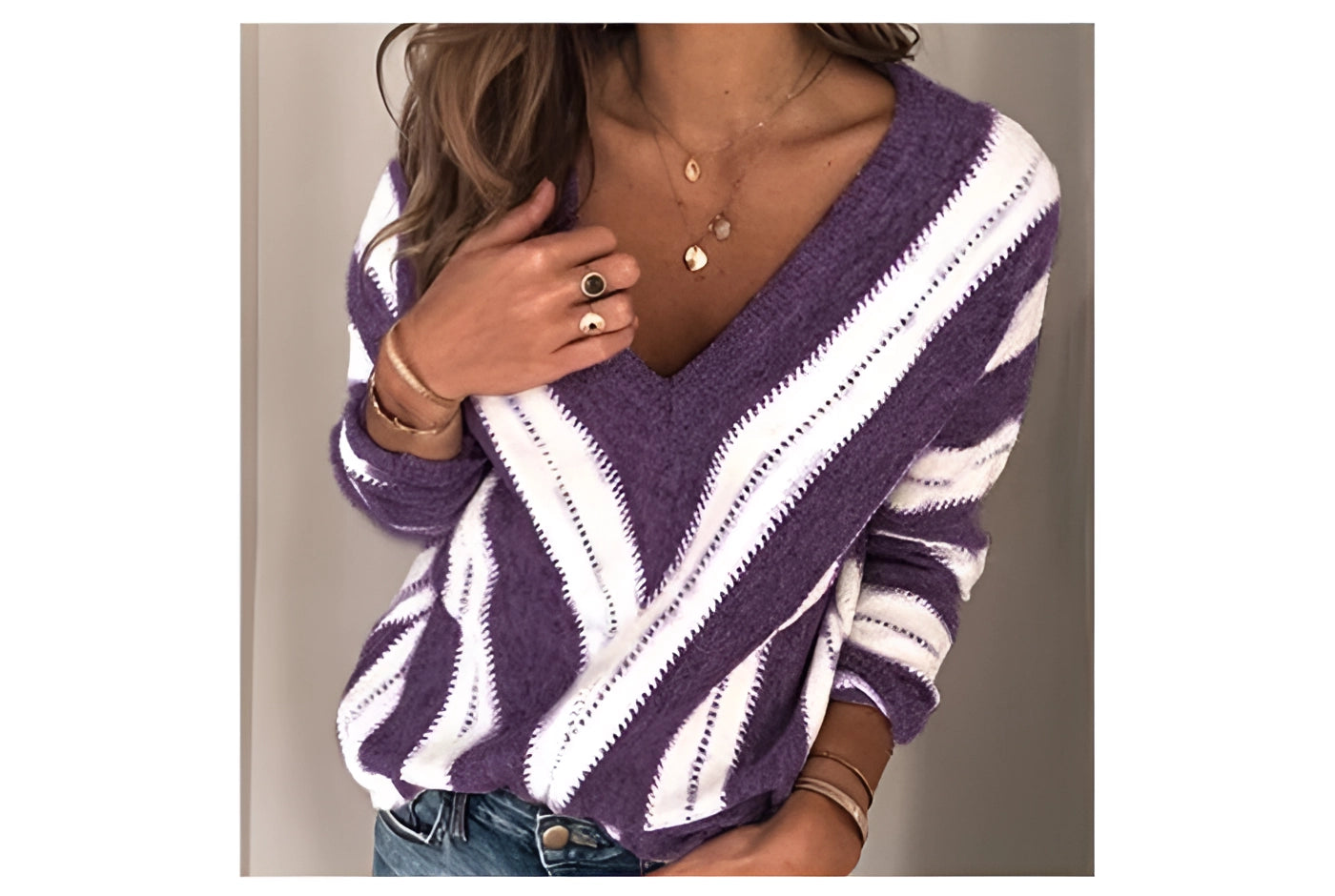 The Brown White V-Neck Striped Knit Sweater is a stylish and versatile addition to any woman's wardrobe. This casual pullover is available in a variety of colors including Khaki, Red, Lila, Blue, Black, and Gray, ensuring that there is a perfect shade for every taste and occasion. With sizes ranging from S to 5XL, this sweater caters to a wide range of body types, providing a comfortable fit for everyone. The Danira Women's Knit Sweater combines comfort and style effortlessly. Its V-neck design adds a feminine touch, while the modern striped pattern keeps the look trendy and chic. Made from soft knit material, this sweater offers maximum comfort, making it ideal for everyday wear or relaxed leisure looks. The standout features of this sweater include its soft knit material that ensures coziness, a stylish striped pattern that adds a contemporary flair, and a V-neck that provides an elegant and feminine touch. Whether you're dressing up for a casual day out or looking for a cozy option for lounging at home, this sweater is a must-have. Its combination of style, comfort, and versatility makes it a valuable addition to any wardrobe, perfect for those who appreciate both fashion and functionality.