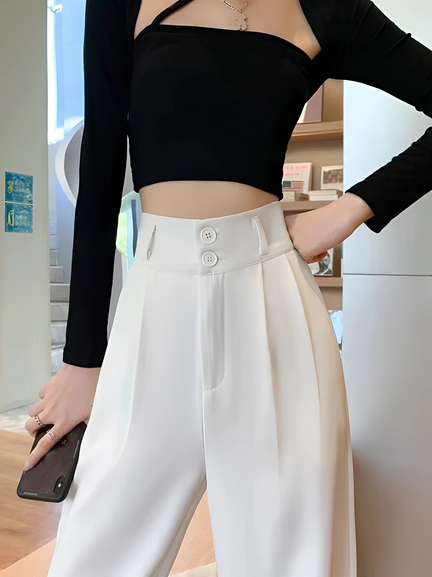 1 - Chic Urban Women's Fashion: Wide-Leg Trousers, Cropped Tank Top, Cardigan |