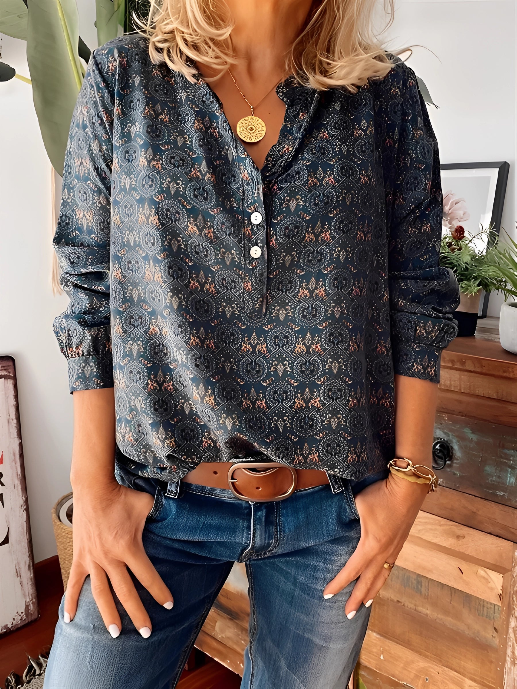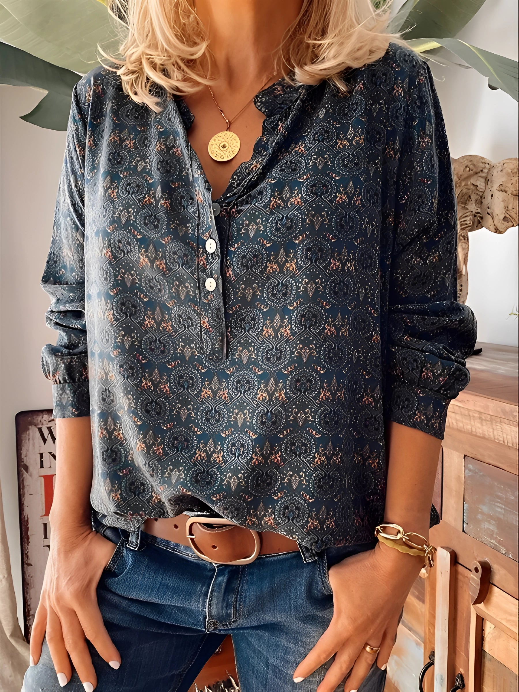 1 - Floral Boho Chic Women's Blouse - Long Sleeve Mandarin Collar Top |