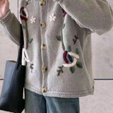 The Floral Embroidered Women's Ivory Cardigan is a perfect blend of stylish retro elegance and timeless comfort, making it an essential addition to any winter wardrobe. This cardigan, available in sizes XS, S, M, L, and XL, and in colors Beige and Gray, features a charming vintage look with its braided structure and round neckline. The button placket adds a practical yet stylish accent, making it ideal for cooler days by providing warmth and an appealing aesthetic. The unique selling points of this cardigan include its braided design, which gives it a distinctive, textured appearance, and its versatile style, allowing it to be paired with various outfits for either a classic or modern look. Additionally, it offers comfortable wear, keeping you warm and stylish, making it perfect for everyday use. The Vinitora Retro-Cardigan is not just a piece of clothing but a statement of style and comfort, ensuring you stay cozy while looking chic throughout the winter season.