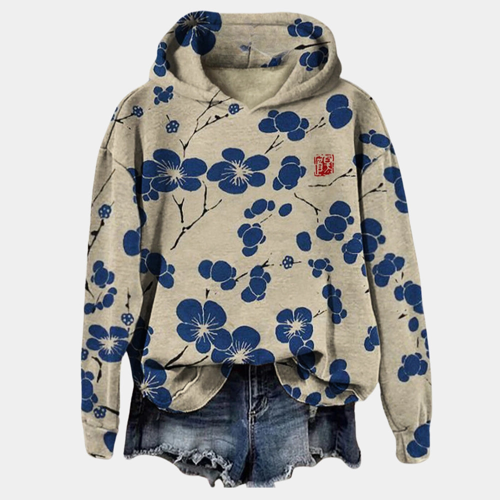 1 - Floral Print Oversized Hoodie - Beige & Black, Women's Cowl Neck |
