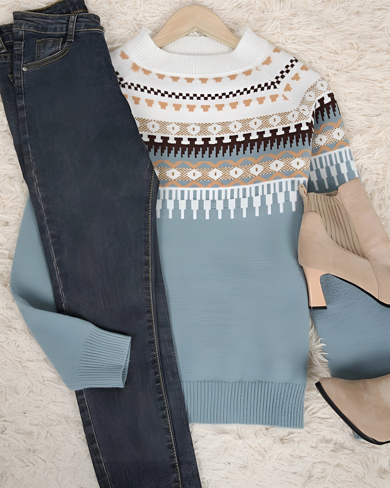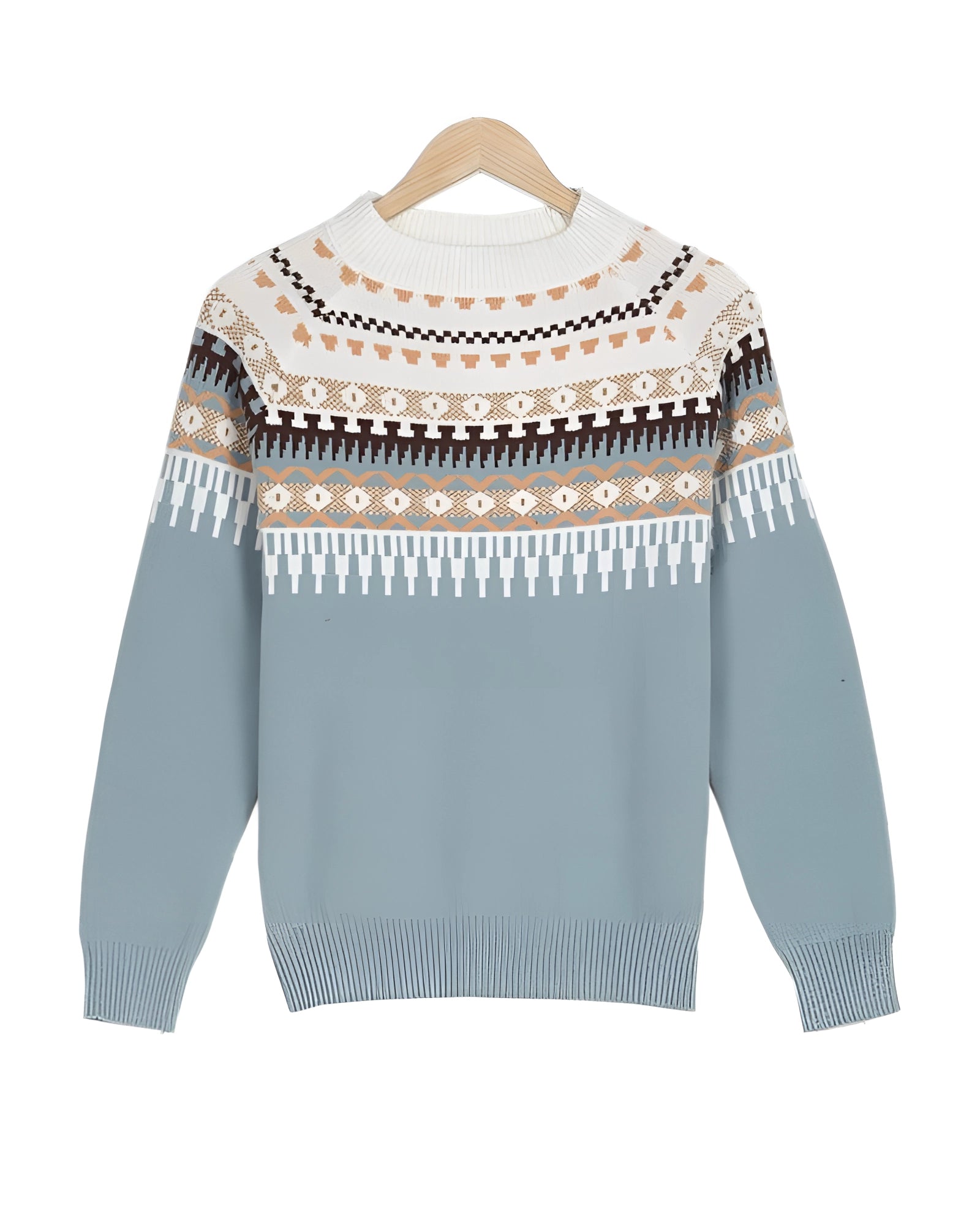 The Mint Green Fair Isle Women's Sweater is a cozy piece of Scandinavian knitwear that combines elegance with comfort. This stylish women's pullover features a classic Norwegian pattern in soft blue and cream, reminiscent of traditional winter fashion. Crafted from high-quality, soft material, it offers both warmth and a touch of sophistication, making it an ideal companion for chilly days. The sweater is available in a variety of colors, including Blue, Gray, and Rose, allowing for versatile styling options. Additionally, it comes in a wide range of sizes from S to XXL, ensuring a perfect fit for everyone. The intricate details and luxurious feel of the fabric make this sweater a standout piece, perfect for both casual and more refined occasions. Whether paired with jeans for a relaxed look or with elegant trousers for a more polished appearance, this sweater is sure to be a head-turner. Its combination of comfort, style, and versatility makes it a must-have addition to any winter wardrobe.