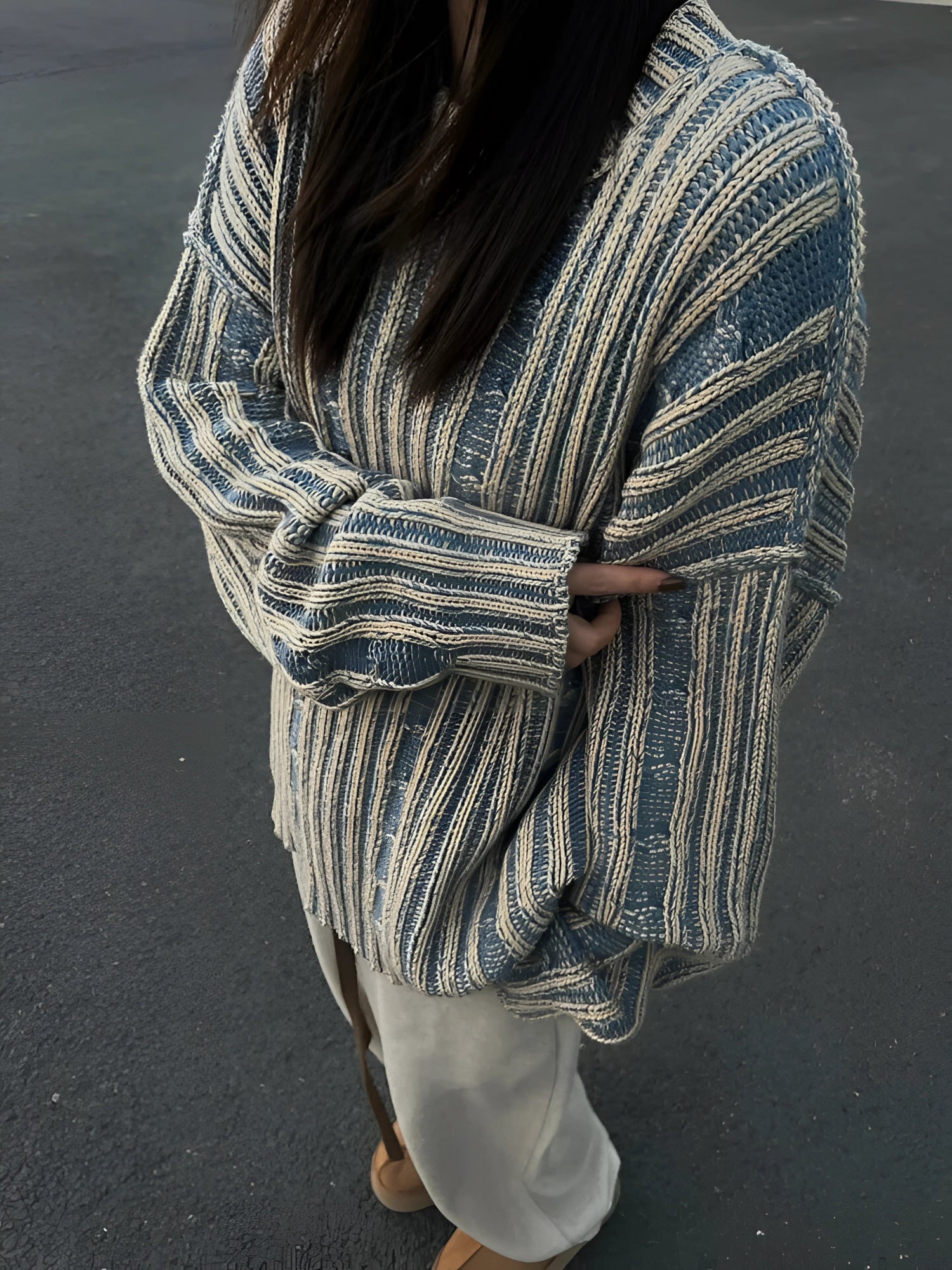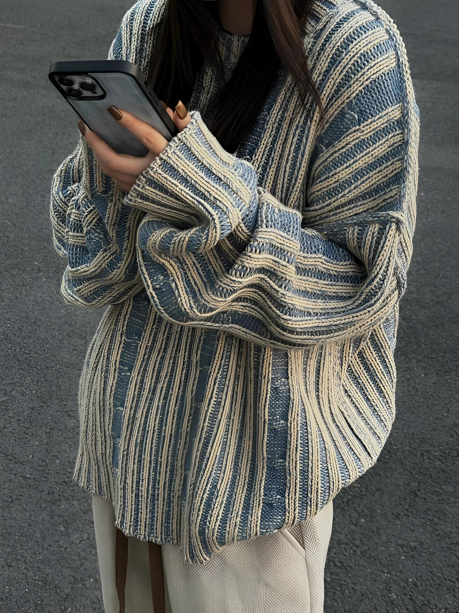 Oversized Blue Stripe Knit Sweater - Women's Autumn Fashion