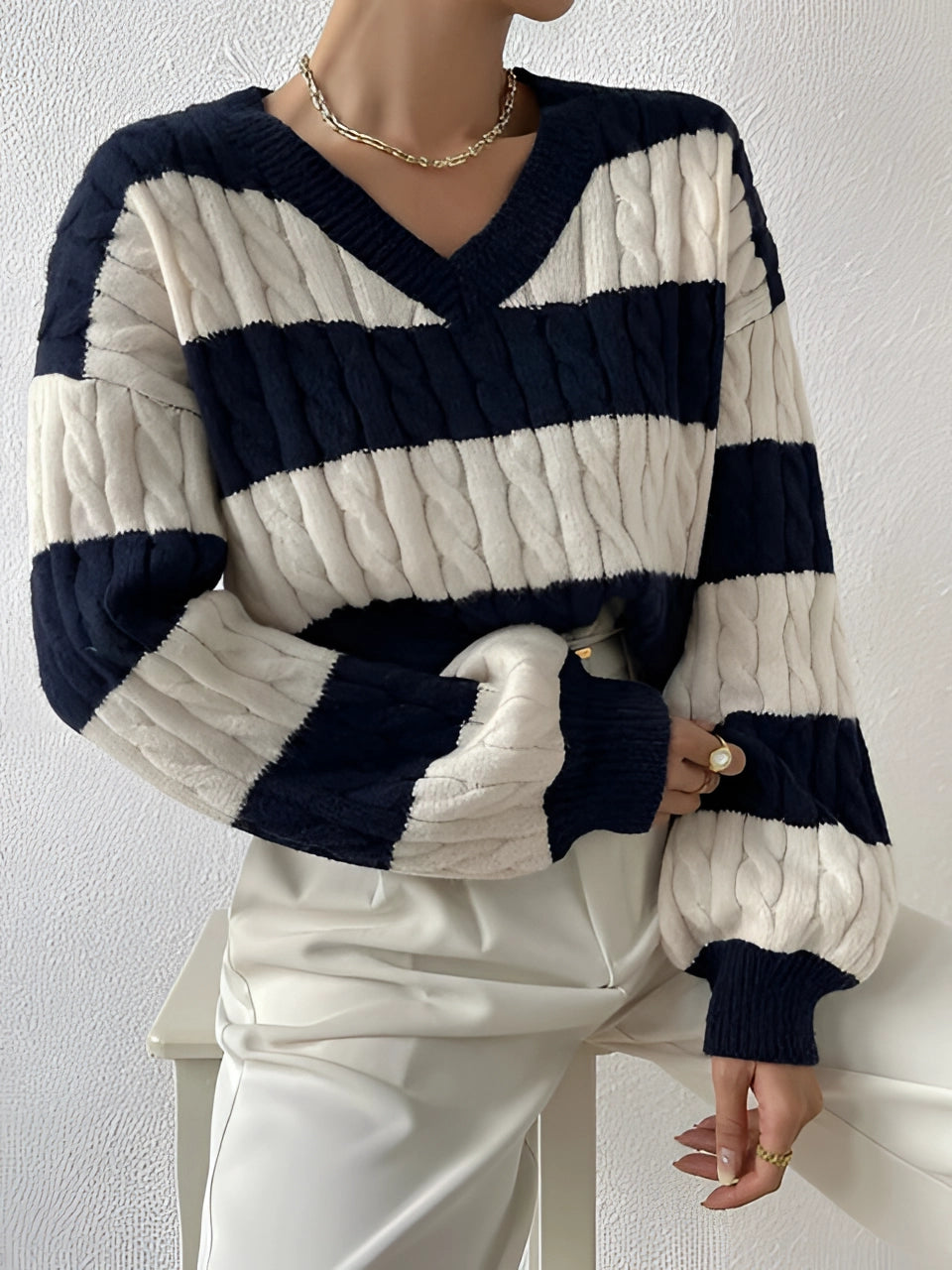 The Striped Cable Knit Women's Sweater in Brown Beige with Puff Sleeves and a Crewneck is a perfect blend of timeless elegance and modern style. This sweater, known as the Nerica Pullover, is designed to be a staple in any wardrobe, offering a classic look that never goes out of fashion. Available in two sophisticated colors, Marine Blue and Khaki, and a range of sizes from S to XL, it caters to a variety of style preferences and body types. The sweater is crafted from high-quality materials, ensuring not only a luxurious appearance but also exceptional comfort and warmth, making it ideal for the colder months. One of the standout features of this sweater is its timeless design, which allows you to maintain a stylish appearance regardless of changing fashion trends. Additionally, its versatility is unmatched; it can be elegantly paired with trousers or a skirt for a more formal look, or dressed down with jeans for a casual outing. This adaptability makes it suitable for any occasion, whether you're heading to the office or enjoying a weekend brunch. The Nerica Pullover is more than just a piece of clothing; it's an essential addition to your wardrobe that combines style, comfort, and versatility in one elegant package.