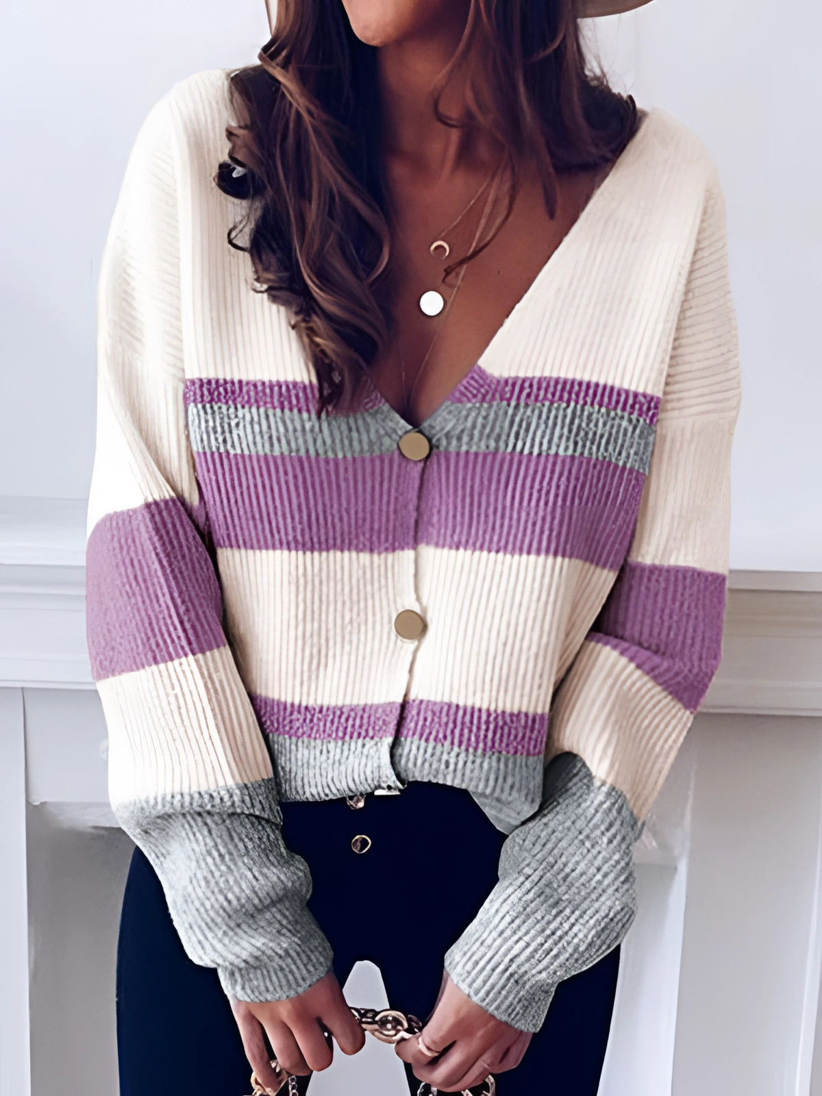 The Striped V-Neck Button-Front Two-Tone Women's Cardigan Sweater, known as the Lyora Strickpullover, is an elegant and modern addition to any wardrobe, perfect for making a stylish impression. This cardigan combines a chic design with a casual striped pattern and button-front detailing, offering a versatile look that can be dressed up or down. The deep V-neckline adds a feminine touch, making it a versatile piece that complements various outfits. Crafted from soft knit fabric, this sweater ensures maximum comfort and timeless style, making it suitable for everyday wear or special occasions. Available in four distinct color styles—Style 1, Style 2, Style 3, and Style 4—and a range of sizes from S to XL, it caters to diverse fashion preferences and body types. The trendy stripe pattern and button details create a modern, adaptable look, while the deep V-neckline allows for different styling options, enhancing its elegance and femininity. The soft material provides a pleasant wearing experience, making it an ideal choice for both casual and formal settings. This cardigan is a must-have for those seeking a blend of comfort, style, and versatility in their wardrobe.