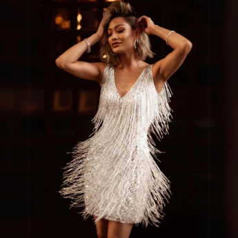 The chic party dress with shimmering fringes is crafted from high-quality polyester and features a sleeveless design for a stylish appearance. Its eye-catching, lustrous fringes make this dress ideal for special occasions and celebrations. Available in classic White and Gold, this dress offers choices to suit diverse tastes and preferences.