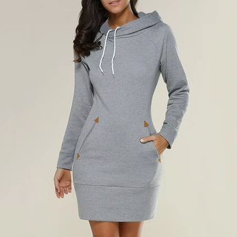 The Charcoal Grey Women's Long Sleeve Hoodie Dress with Pockets is a versatile and stylish addition to any wardrobe. Crafted from a soft and cozy sweatshirt blend, this knee-length dress ensures warmth and comfort on cooler days. Its casual and sporty design is enhanced by a practical front zipper closure, long sleeves, and a hood, combining style with functionality. Available in a range of colors including Gray, Black, Red, and Light gray, and sizes from S to XXL, this dress caters to diverse preferences and body types. The knee-length cut and loose fit offer a comfortable and flattering silhouette, making it perfect for casual outings. The breathable fabric makes it an ideal choice for indoor wear or dry, cool climates. Additionally, the dress features convenient pockets, adding to its practicality. With free shipping included, this hoodie dress is not only a fashion statement but also a practical choice for those seeking comfort and style in one package.